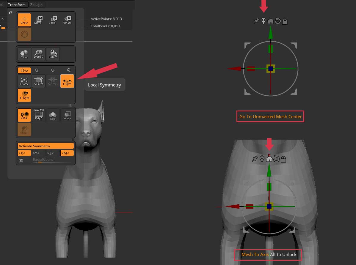 If Symmetry still doesn’t work properly because your mesh is not fully symmetrical then you have one more option: the Tool>Geometry>Modify Topology>Mirror And Weld button. This will copy one side of the model (the left side when the model is facing you) and mirror it to the other side, welding the result, so it will have perfect symmetry. You can change the axis by clicking on the little X, Y or Z in the button.