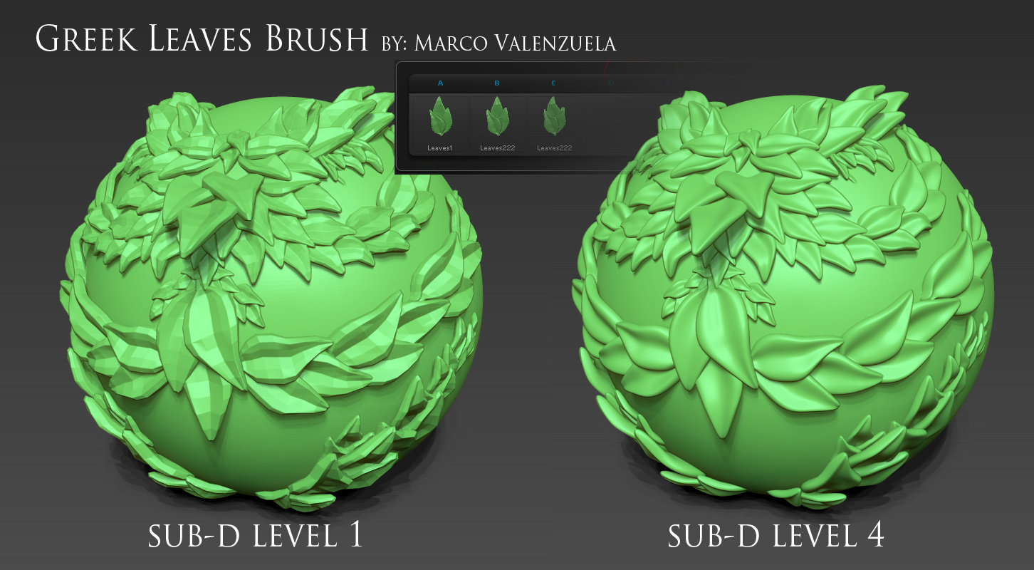 Hello all. A while back you may have seen my leaf art work on the Lone Star Ring I modeled. http://www.zbrushcentral.com/showthread.php?170538-Lone-Star-Ring-for-3d-Printing-Jewelry&highlight=lone+star+ring I decided to make a Greek Leaves IMM Brush. The brush is made of three variations of a basic three-grouping olive leaf model. The insert meshes are semi-low poly and sub-divide well for sculpting. MV_Greek_Leaves.zip (22.3 KB)