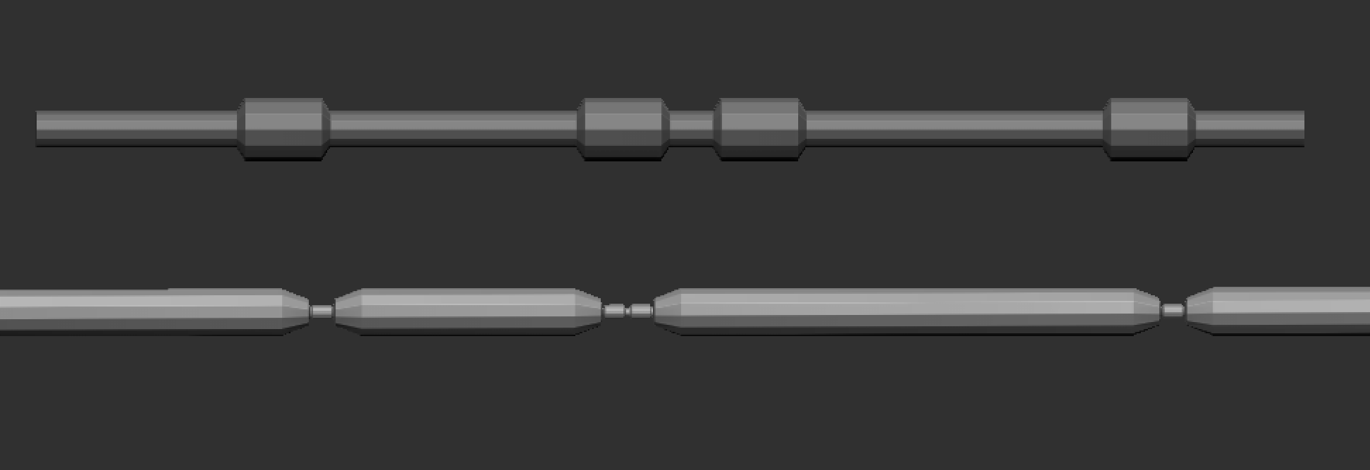 The top mesh is what I am trying to achieve (hand modeled, not on a curve). The bottom mesh is what the InsertMultiMesh is creating, on a curve, cycling in a random way (Variations 10, Variation Selector 3). The larger mesh is tiny and the small ones are large. The meshes were crated using the same cylinder. They appear to mach perfectly as sub-tools before creating InsertMultiMesh.