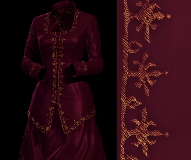 Excellnt work on the dress Magda…are you planning on exporting for full final render? If so maybe go for a nice shiney satin / silk effect on the embroidery. There’s certainly no mistaking your style.