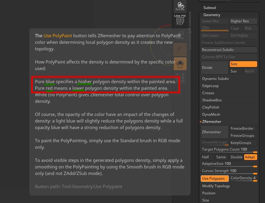 Look at the first screenshot (the hint inside ZBrush), there is BLUE for more density