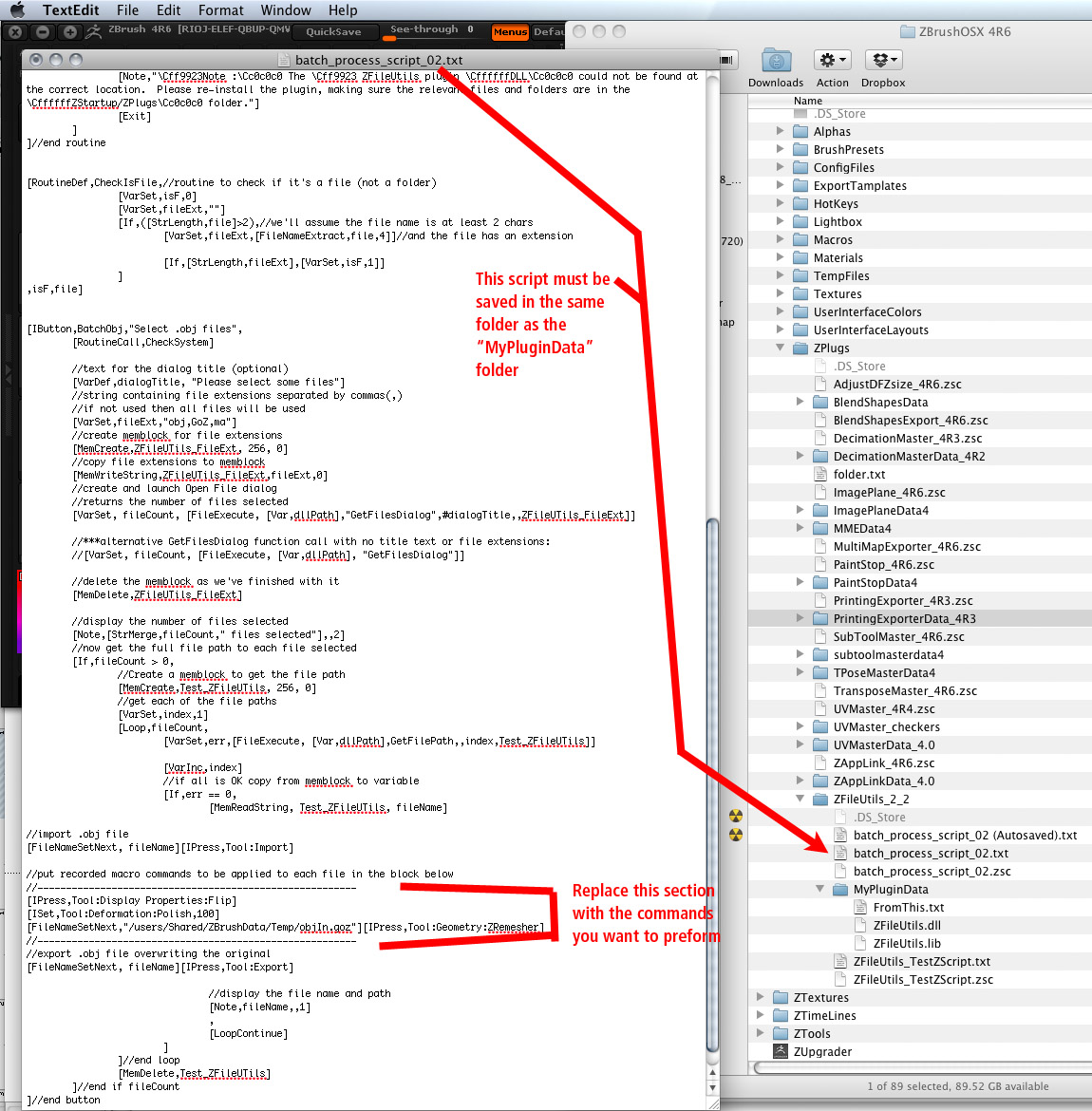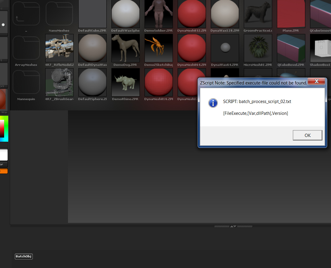 You must put the batch process script in the same folder as the “MyPluginData” folder or Zbrush will not be able to find the plugins. The attached image shows where I put the files.
