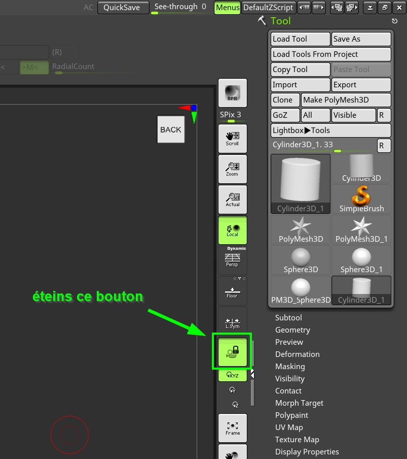 bonjour mais non le bouton est désactiver, cela ne fait pas longtemps que ca me fait cela j’ai essayer de réinitialiser zbrush mais rien.