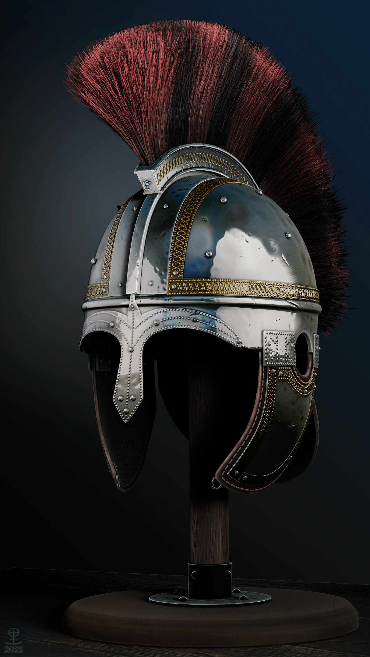 Here is the final render of a late roman helmet entirely made with ZBrush. Photoshop compositing based on Zbrush render passes.