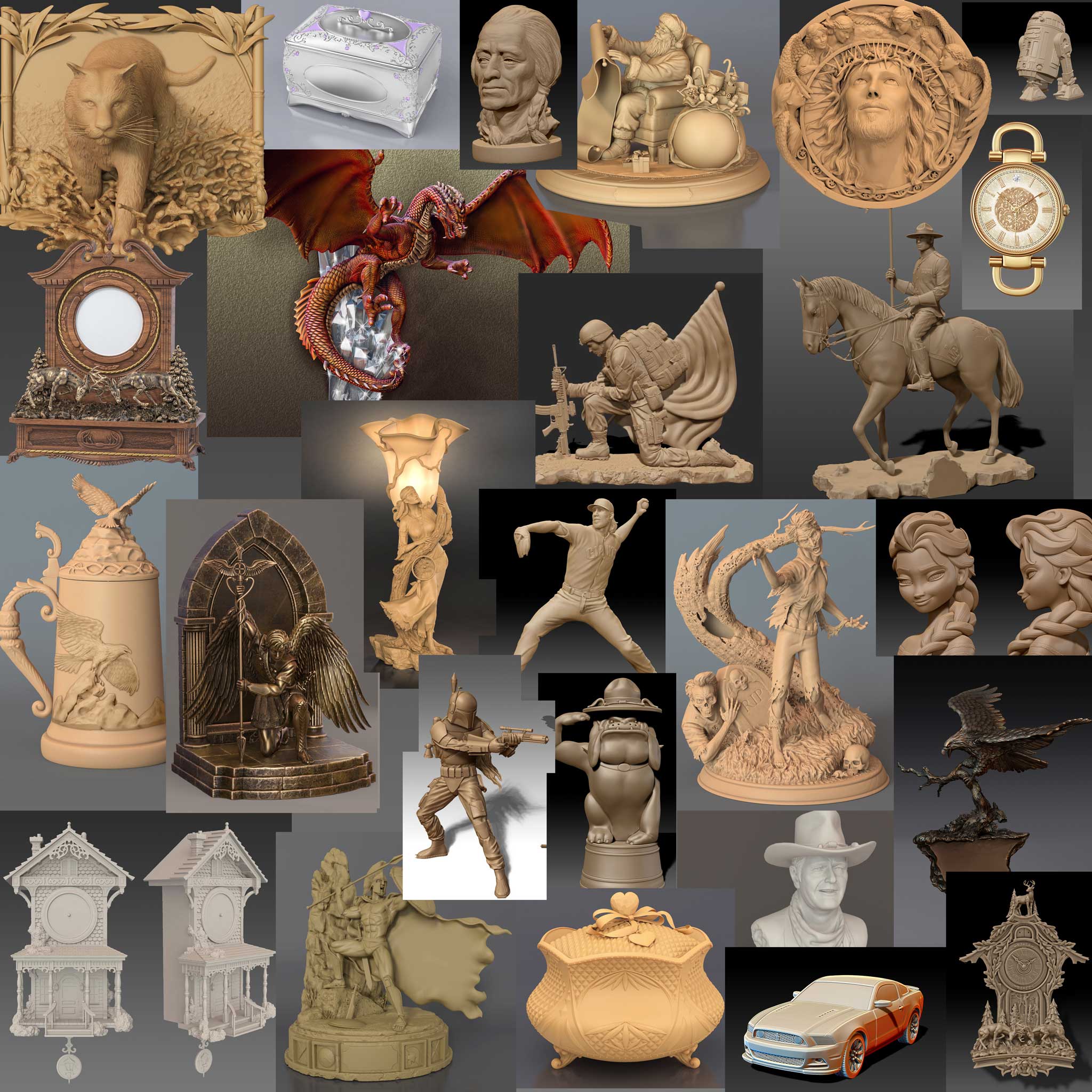 Strong sculpting in varied subject matter, both in soft and hard surface modeling.