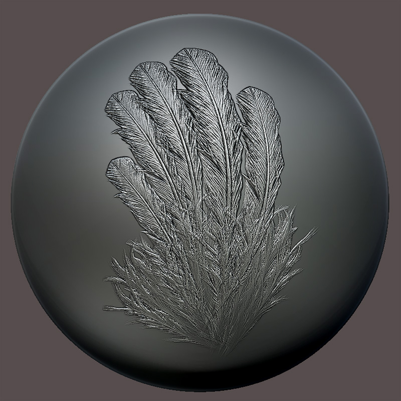 with the help of “Dodge” and “Burn tool” create the individual strands, “Surface blur” creates a rough basis for relief. Upper layer with “Multiply”-effect of adding small details over the basics. “Gaussian blur” avoids unnecessary noise by using a brush in zbrush