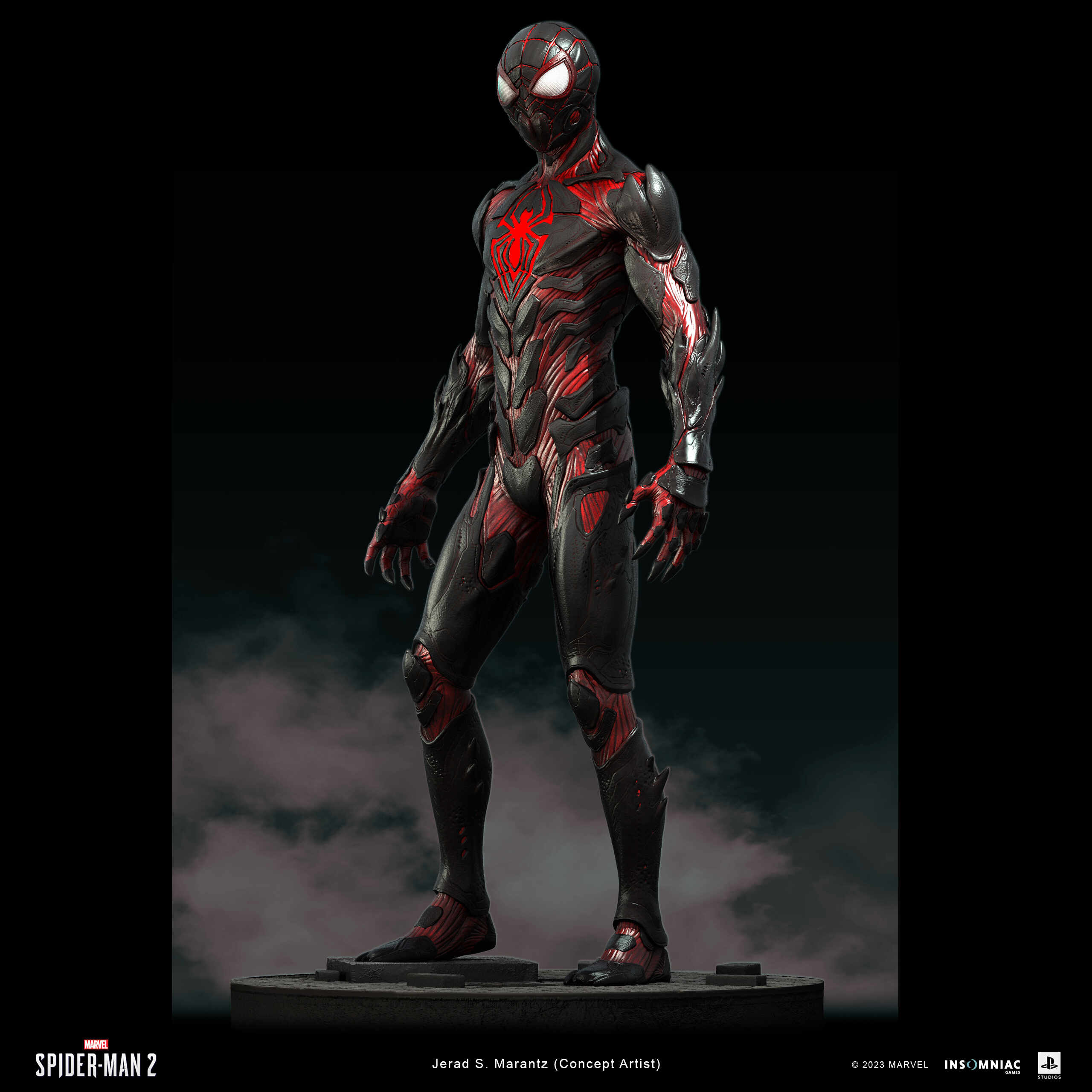 This is my Bio-Mechanical Miles Morales suit for Spider-Man 2 for the PS 5. I had such an amazing time working with the team over at insomniac! This was a dream job. I was contacted and asked to come up with my own version of the Miles Morales suit. Creative freedom is something that I think all artists crave and I got it! It was so exciting because I love Miles‘s character. I wanted to design something that really resonated with me. I’ve been a huge fan of anime over the years and I really wanted to do a creature suit for Miles. Miles’s powers have always seemed “next level to me“. For this suit, I originally sketched it out and then once the design was approved I had to model it in Zbrush. It was a lot of fun to sculpt.