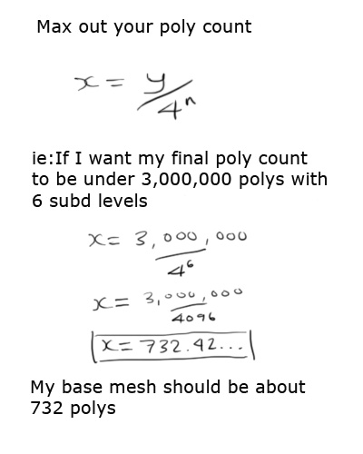 I’m sure most of you have already figured this out…but for those who havn’t…This is useful in helping you plan how many polys your base mesh should have. You can use it to figure out how many polys your mesh will have at any given subd level, so you get the maximum polys your computer can handle instead of being stuck with a lowish maximum poly count.