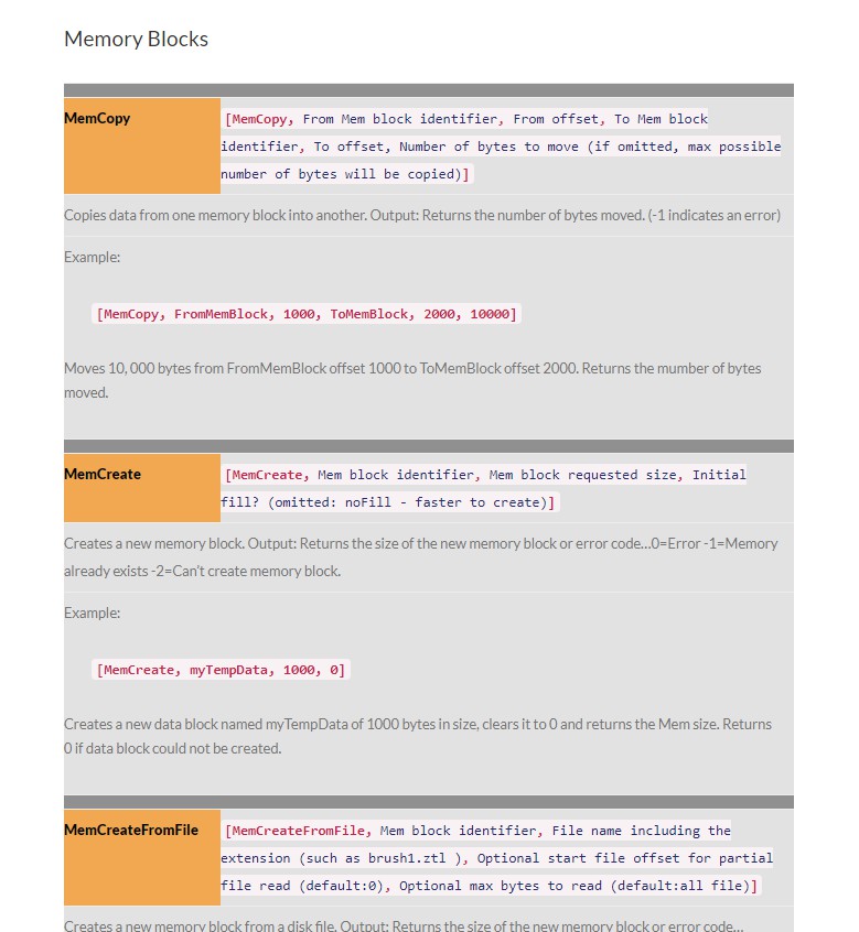 The simplest way to create and use a memory block is by using the [MVarDef],[MVarSet] and [MVarGet] commands. These are very similar to [VarDef],[VarGet] and [VarSet].
