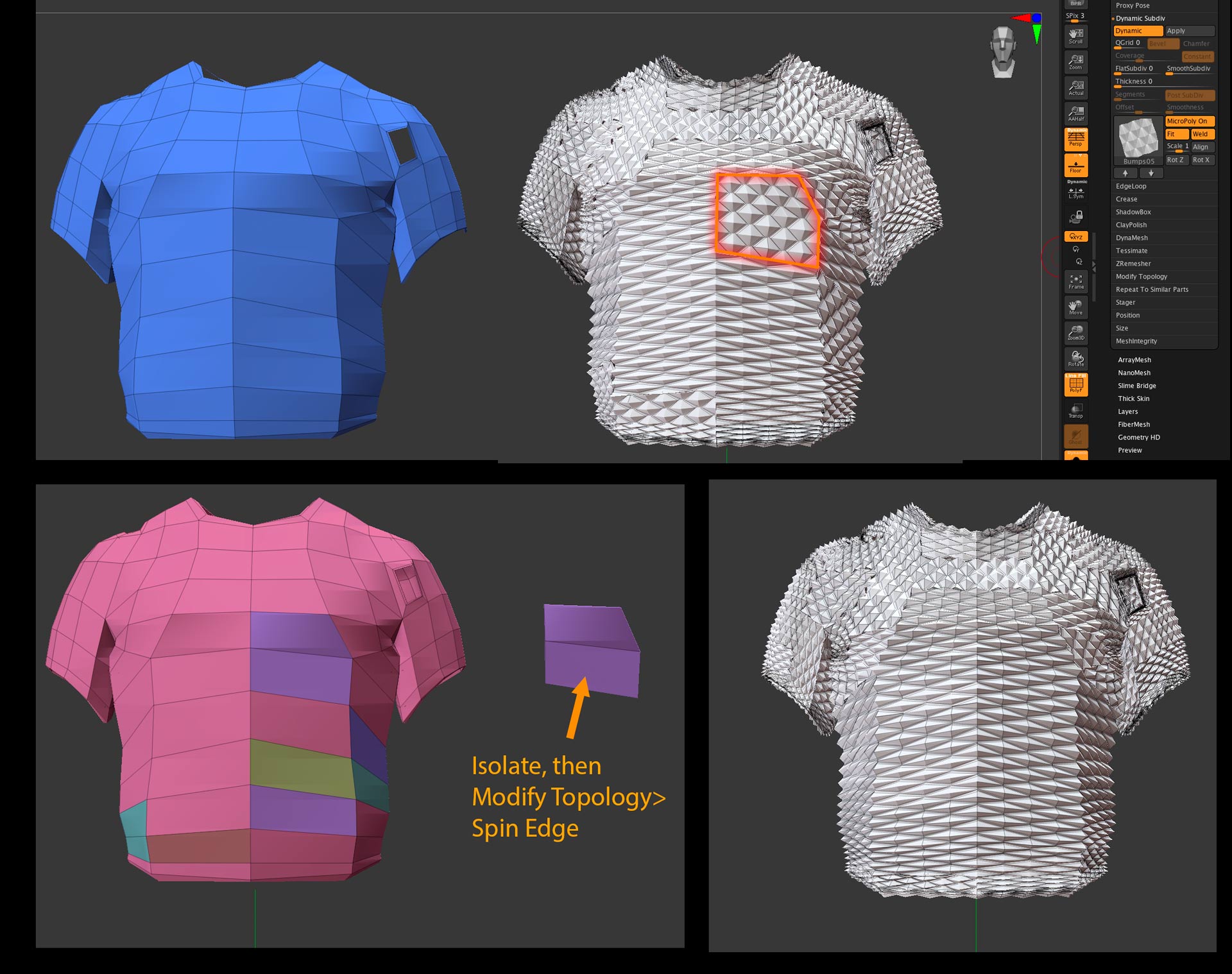 Please note that all of these are completely dependent on the underlying mesh topology. If it is not aligned or poorly shaped, your results will be also. When working with the small scale of cloth-like fiber detail this is not easily seen. However if you are using the feature to create large pieces of geometry, any alignment issues will be very clear to the naked eye.