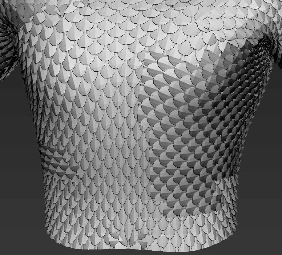 You’ll notice on the front of the shirt there is a group of two polygons that simply will never match the others. So I toggle Dynamic SuBD back off and hide everything but that group. Im using ZModeler to quickly assign unique poly groups to problem polygons to make them easier to hide/unhide at will.