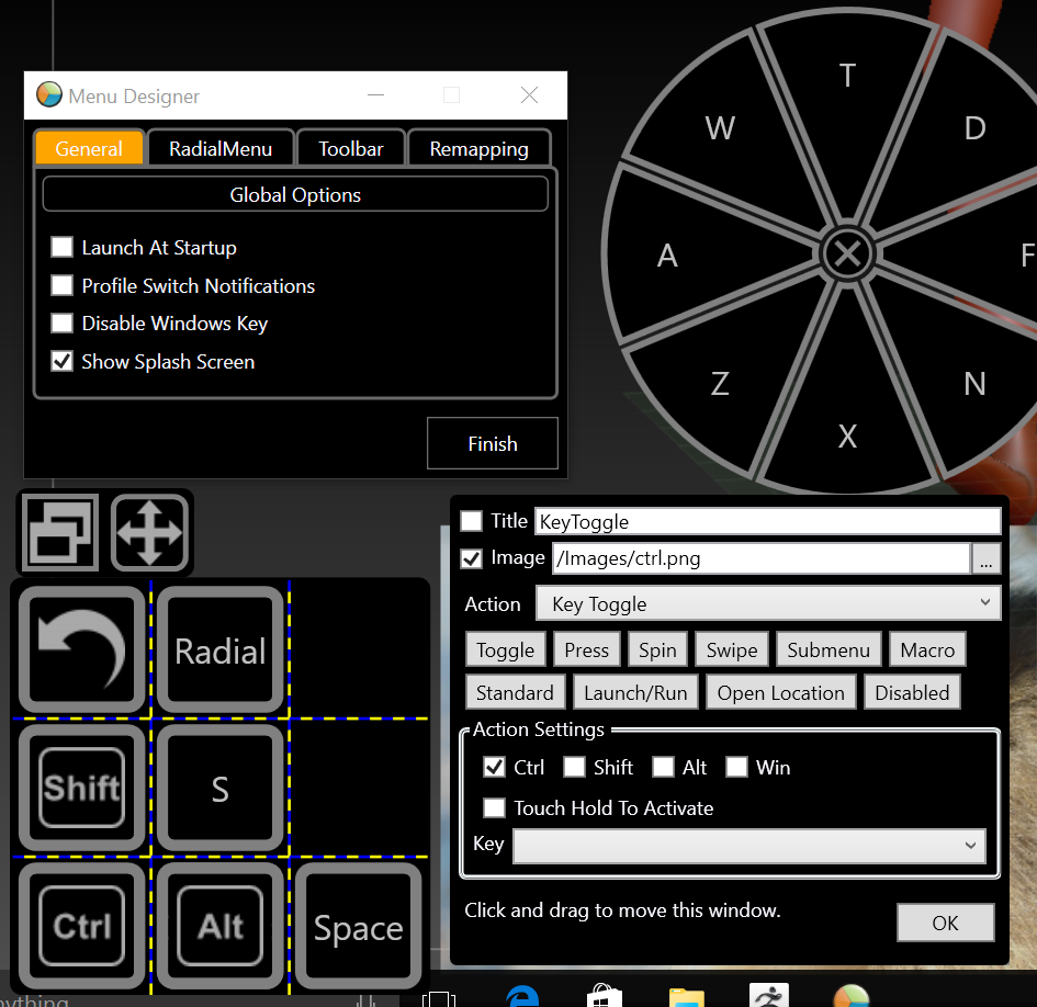 As I made a point to mention, having too rigid an expectaton with on-screen keys might lead to disappointment. With a small adjustment in the way I work with ZBrush, I opted to configure my RadialMenu keys for Shift, Ctrl and Alt to toggle on or off instead of trying to make them act like momentary ones: