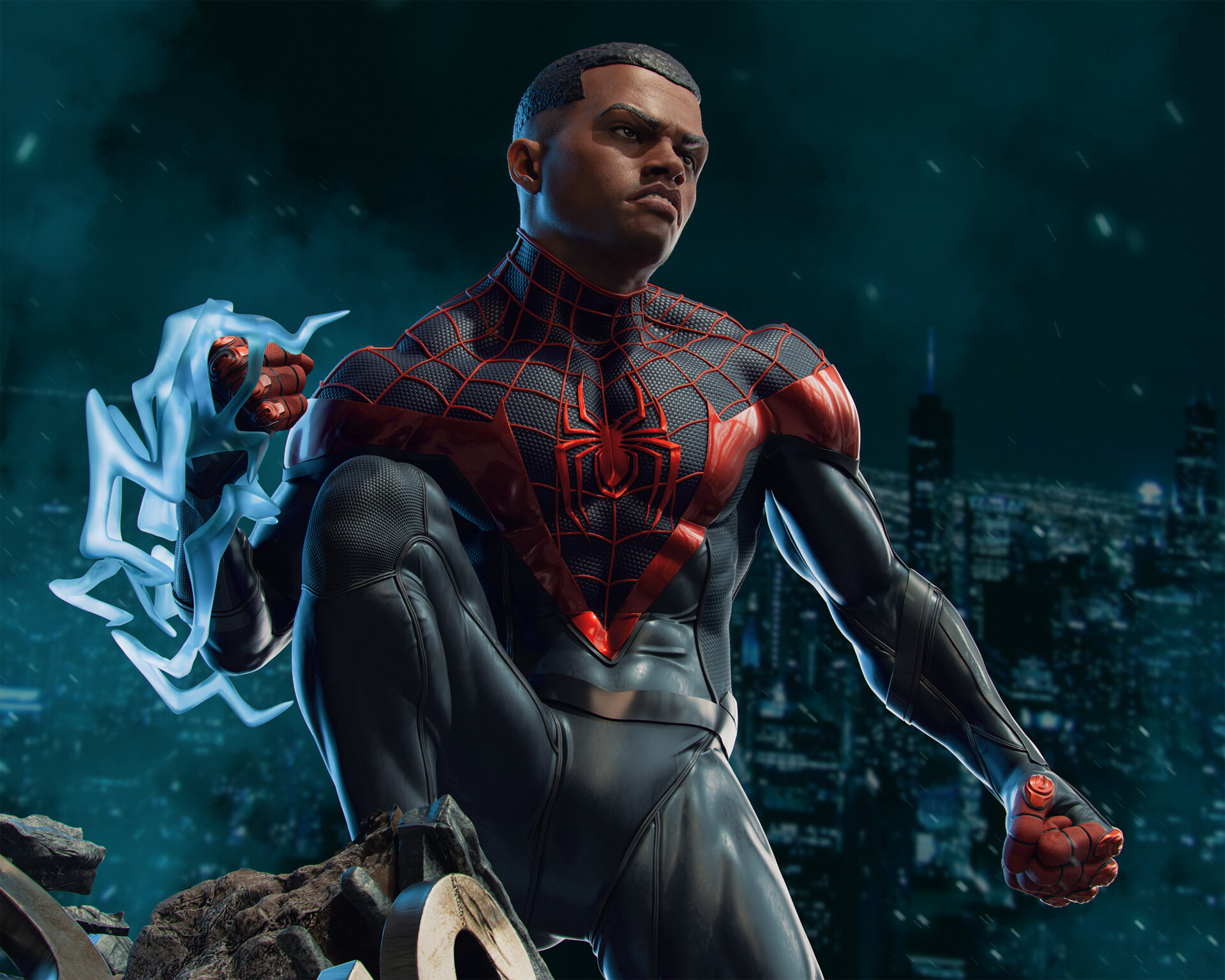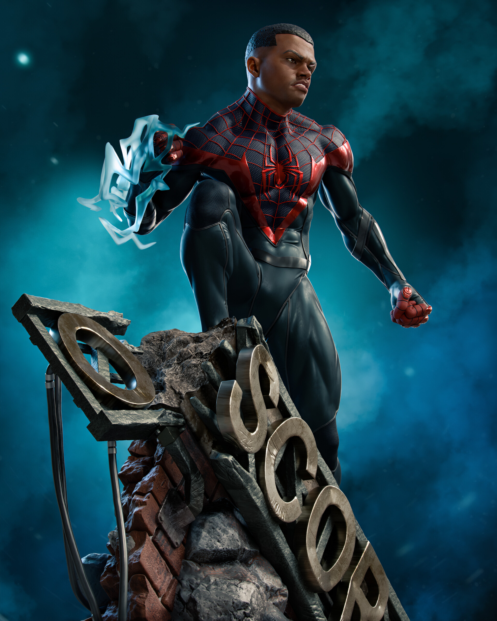 to portrait Miles after a battle with Doctor Ock, at the top of the ruins of Oscorp Labs
