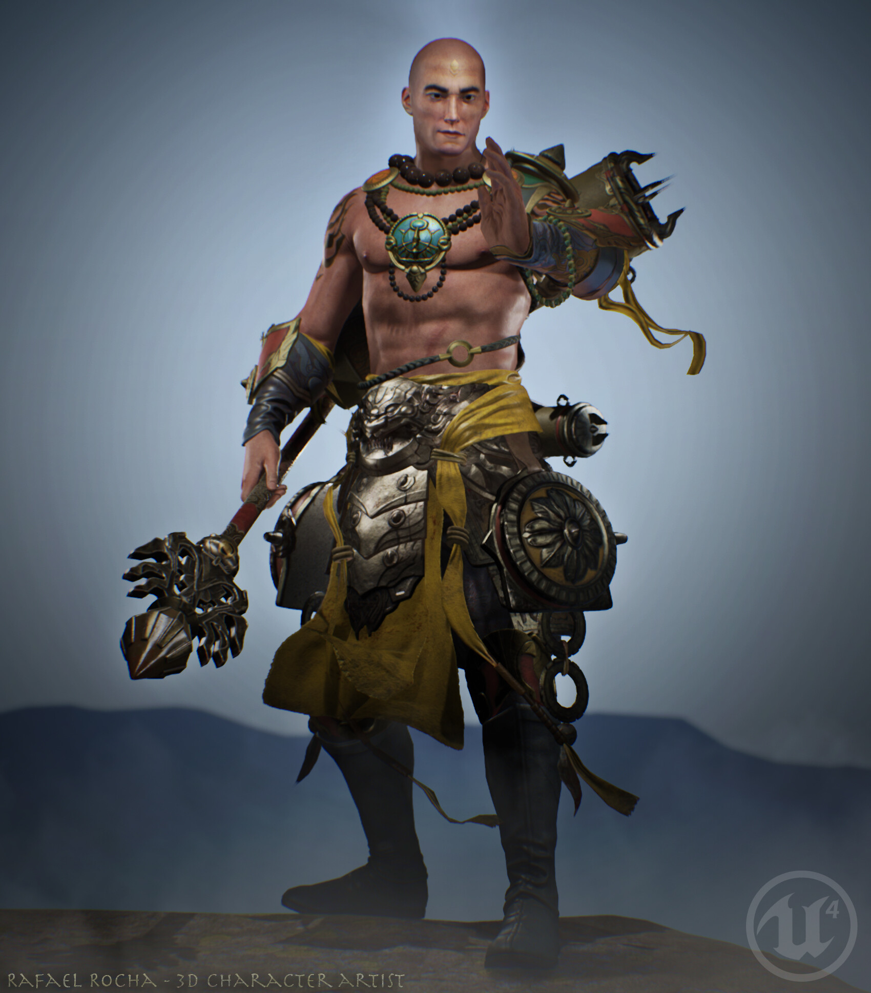 Hey everyone, I’m pleased to present my first character in Unreal 4. Even though I decided to make small changes to add my own ideas of storytelling for him through the details, my goal was to keep the feeling of the original concept art. My process of creating this character started by doing: Highpoly (Zbrush)-> Lowpoly and UVs (Maya) ->Baking (Marmoset)-> Texturing (Substance Painter) and hair cards (Substance Designer)-> Lighting and Material Shaders(UE4). I started working on it during my mentorship with Bernardo Cruzeiro (https://www.artstation.com/bernardoyang) and used the character as my final project at Full Sail University for Portfolio 7 class with Dustin Tinkler. The character itself has a total of 65K tris and his weapon has 4K tris.