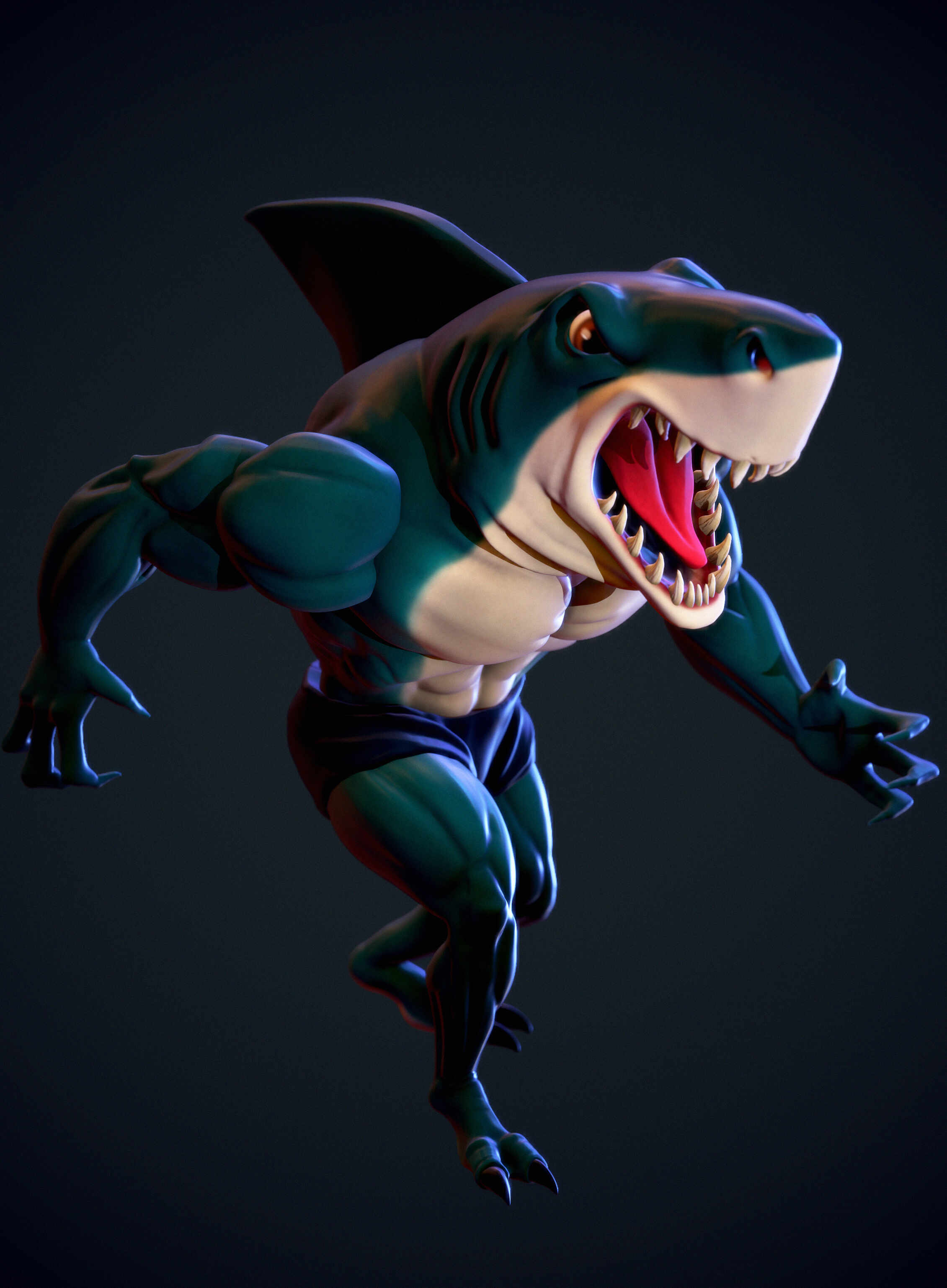 This is a job requested by my son. The briefing was: ‘Make a muscular, angry shark wearing shorts and sneakers.’ But i forgot the tennis
