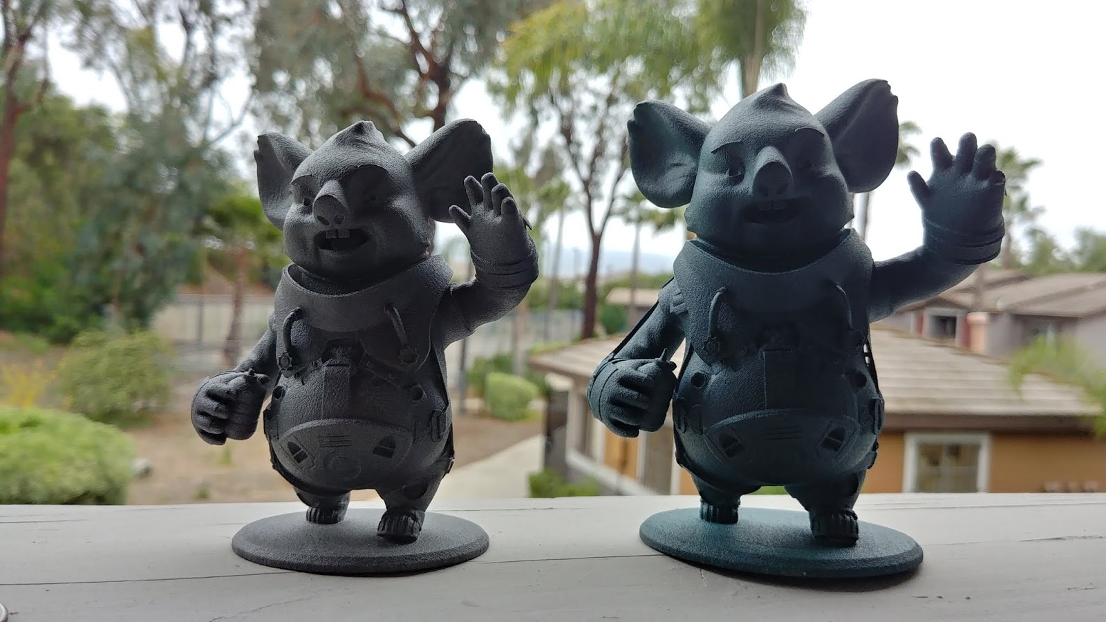 Here are a couple of prints of the space koala. I dyed one green. The gray one is about 4" tall and the Green one is about 4.75" tall. Unfortunately I took my eyes off the green one and it magically moved to a different location and during that time the finger was broken off