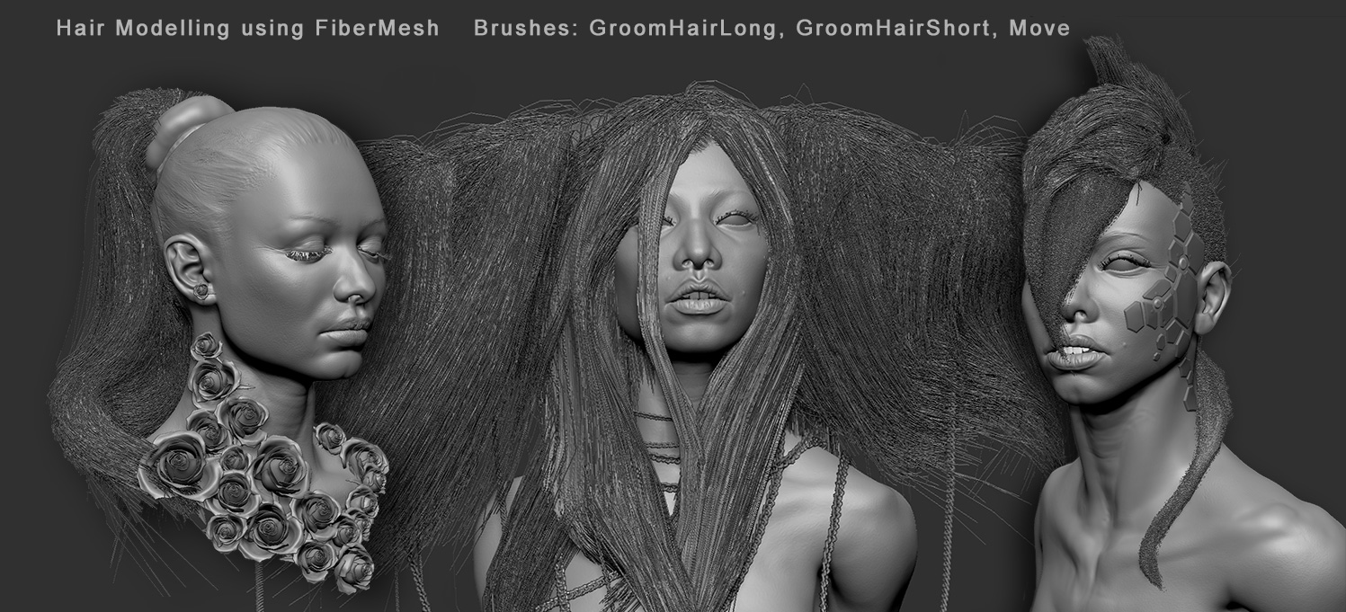 This is rather simple: I divide the model’s skull into polygroups, then I apply FiberMesh there and using polygroups for selection, comb the hair until they’re acquired desired shape.