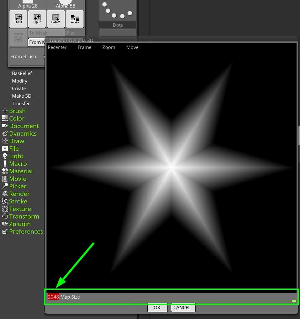 Alternatively, and this would probably be the easiest route, if you want to make an Alpha and use that with UV’s and NoiseMaker, you can select a Plane3D and adjust it to as many polygons you want. All the polygons will be perfectly square and will work really well with NanoMesh. Once you have adjusted the NanoMesh fit, click “One To Mesh”. Now set that mesh on the canvas using Shift to snap it to an orthographic view, then go to “Alpha” palette and click “From Mesh” to create your alpha. Use the “Size” slider to get the size you want then click “OK”. Save the Alpha. I hope this will clear it up for you a bit better.
