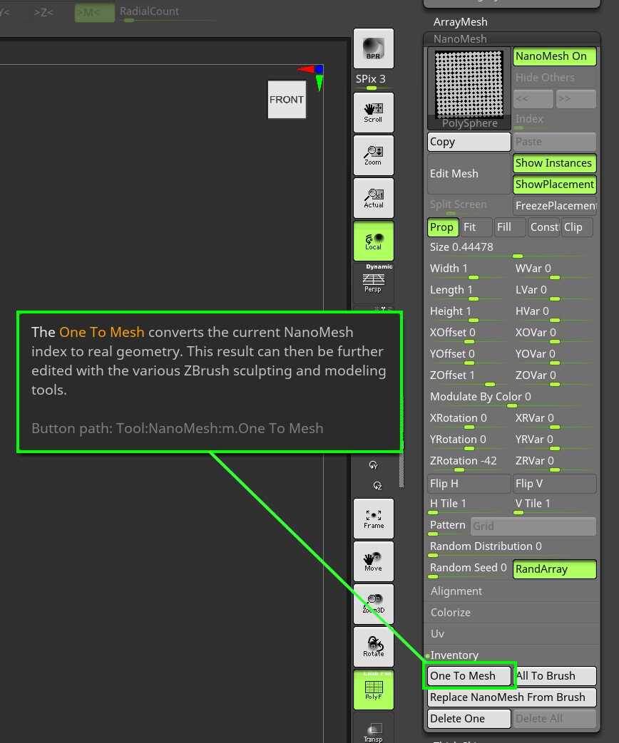 You adjust the NanoMesh to where you want it before you click “One To Mesh”. In order to adjust the NanoMesh, the underlying geometry has to be perfect. You can’t just create a mesh with different polygon sizes and shapes and apply NanoMesh to that. It just won’t work well, especially when your using a complicated shape as the one you are using for the armor. As an example, say you wanted to make a sleeve. You would start with a Cylinder primitive and use “Tool > Initialize” to get the polygons around the outside as square as possible then remove the end caps. Apply your NanoMesh to that and adjust them so they fit perfectly. Now, you would click “One To Mesh” in “Tool > NanoMesh > Inventory”. Now you can manipulate the mesh to the shape you want.