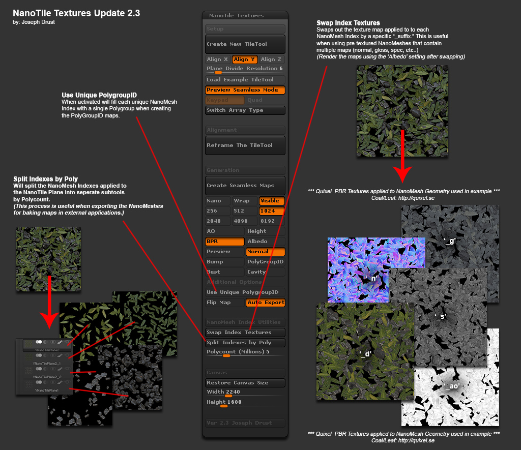 v2.3: Added some NanoMesh index utilities. Added one for swapping textures that are applied to each NanoMesh index by â_suffixâ. Also added the option to split NanoMesh indexes that are applied to the Nanotile plane into separate subtools by polycount for exporting. (Thanks to Phil Baxter for the suggestions and testing.)