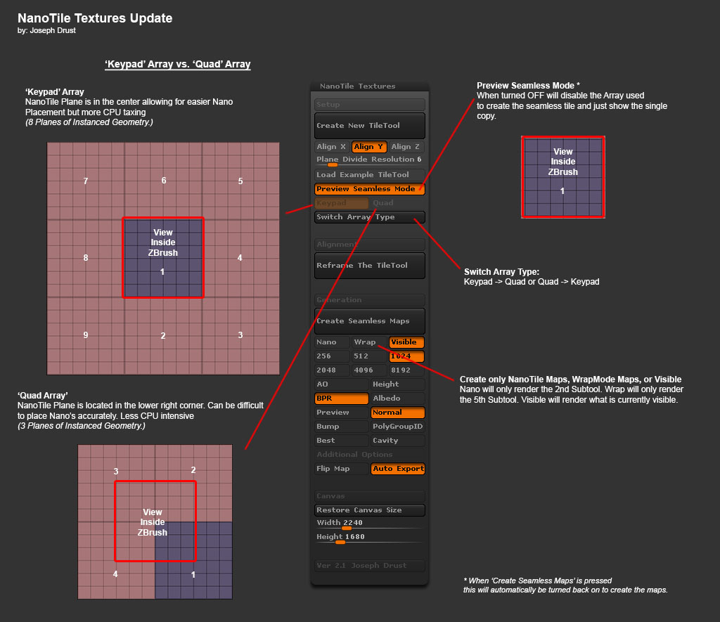 v2.1: Fixed the issue where turning âShow Placementâ off was still rendering with some passes. Fixed 'Best Renderârendering twice. Added some additonal modes to help with Heavy Scenes; âQuadâ Array and âShow Seamlessâ. Added a switch to convert between âQuadâ Array and the original âKeypadâ Array (Thanks goes to Campi.) Added the addition of a âWrapMode Planeâ Subtool (This will allow you to create a sculpted base layer (make sure you have Show Seamless on when using.) Added a Cavity Pass (Thanks to decorix for help on this.)