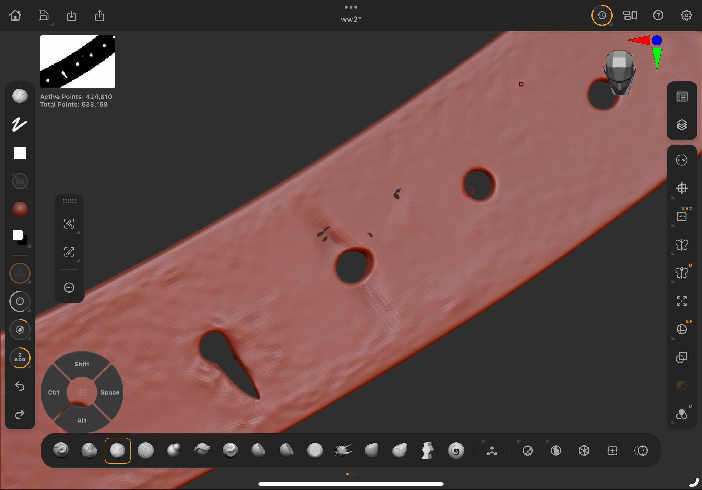 So basically i was in the process of detailing this belt, I had used Remesh ( Tangent polygones to 80 for better remesh) then after that i think i had also frozen my subdivision also had started my detailing work, had used the cut tool in the process, when i was nearly done with my first step of detailing i had slight increased my subdivision (Freeze Subdivision is checked), Now there are holes on some places, which i dont know what have caused it But i need to know better way to solve it on ipad app