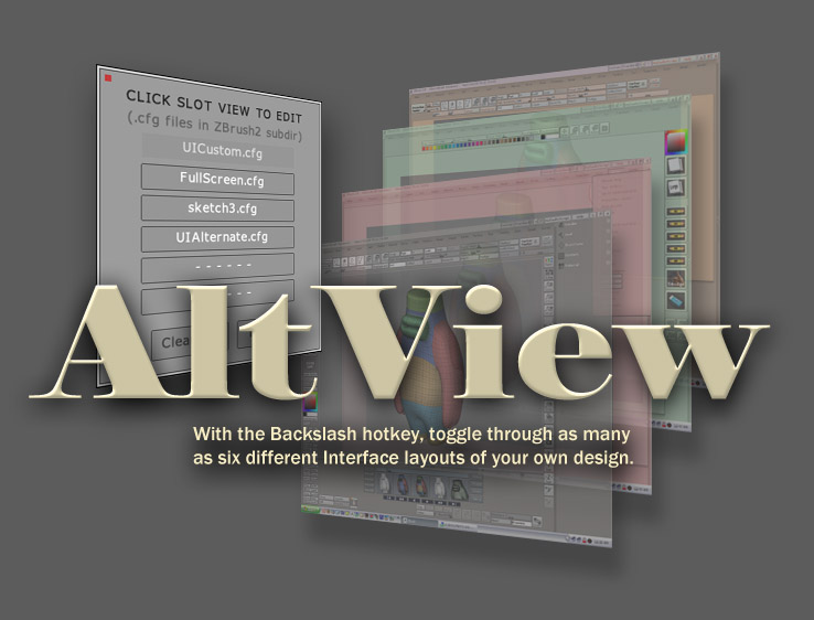 ALTVIEW is a plugin that presents a new development towards more sophisticated ZB interface customization. This simple but powerful tool could revolutionize how you work within ZBrush by using multiple interface layouts. For instance, you might already have different specialized layouts: one for creating ZSphere models, another for composing complex scenes and still another for 2D painting (using the recently posted ZketchPad2 interface designed by Aurick and Glen Southern). Each and every custom interface could previously be saved and loaded manually within the Preferences:Config subpalette menu. ALTVIEW organizes the interface swapping process and enables it through a single hotkey. My hope is that ALTVIEW might encourage users to design custom layout solutions and share those multipage layout setups with the rest of us.