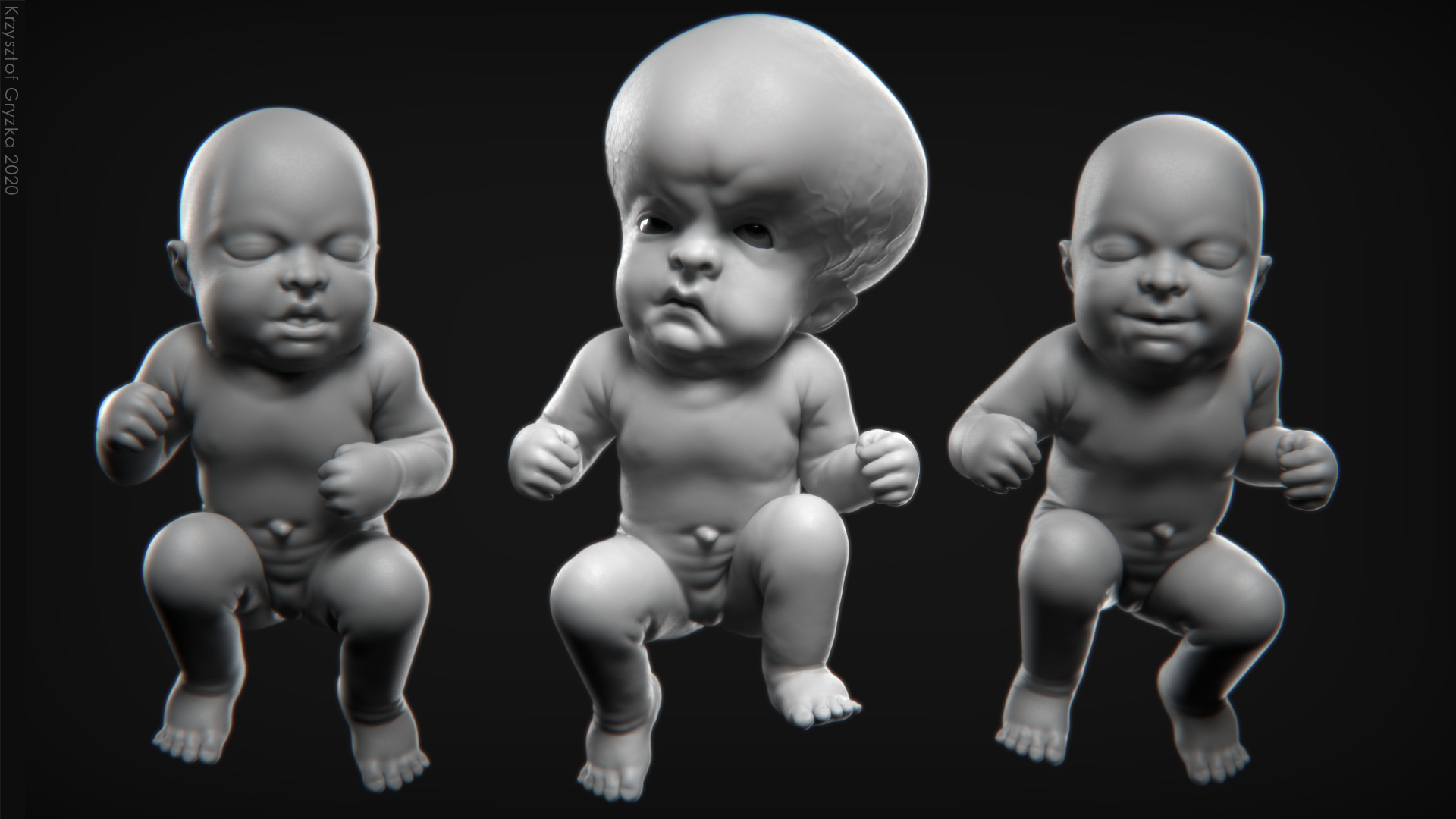 Hello. My last anatomy studies on newborn human. Sculpture was done in 3h. Lighting/shading/rendering in 1h.
