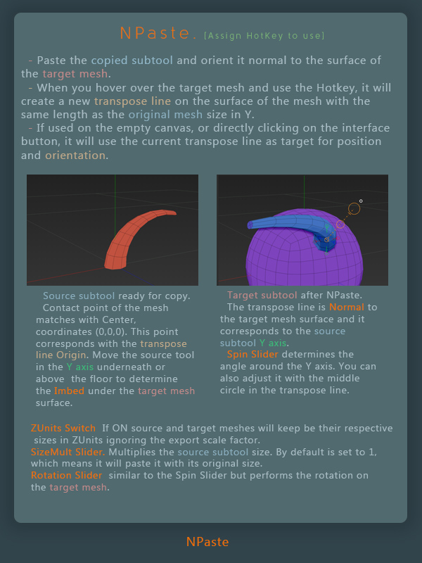 This is a very simple Plugin I made to Copy and Paste, similar to an Insert Mesh brush but keeping the original size of the copied mesh.