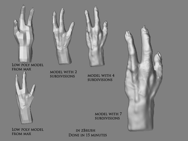 In make in this hand, I have to spend some time modeling in a very low poly model in 3d max, and was exported with quads of polygons without any turbosmooth or meshsmooth been collapsed on the mesh. I took some medical charts for a quick reference of tendons and muscles of the hand. Then I put some nice loops, generating more tensions in the areas of but the nuckles and the nuckles or each finger. This is that, phisiologicaly, the skin wraps around this bones and in those areas the skin is thicker, and it crack itself in millions of lines over this nuckles. So fot the use of the projection master you need more subdivisions in this metioned-before areas. For the part of the nails, I just hate them, sorry for not to model it correctly, but the nails are evolutioned skin. The nails, only in humans, in my concept are just fashioned elements of the structure of human bodys.