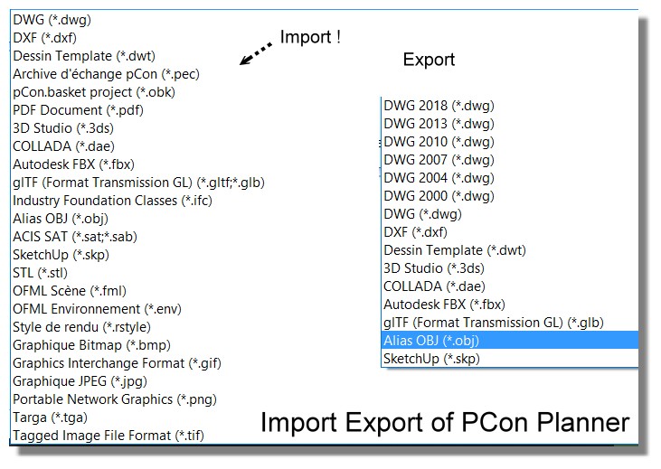3D export formats : some nurbs 3dm, iges, Sat, Step and some 3D others OBJ, STL, SKP, PDF, FBX …and 2D ( AI, dxf ) etc…