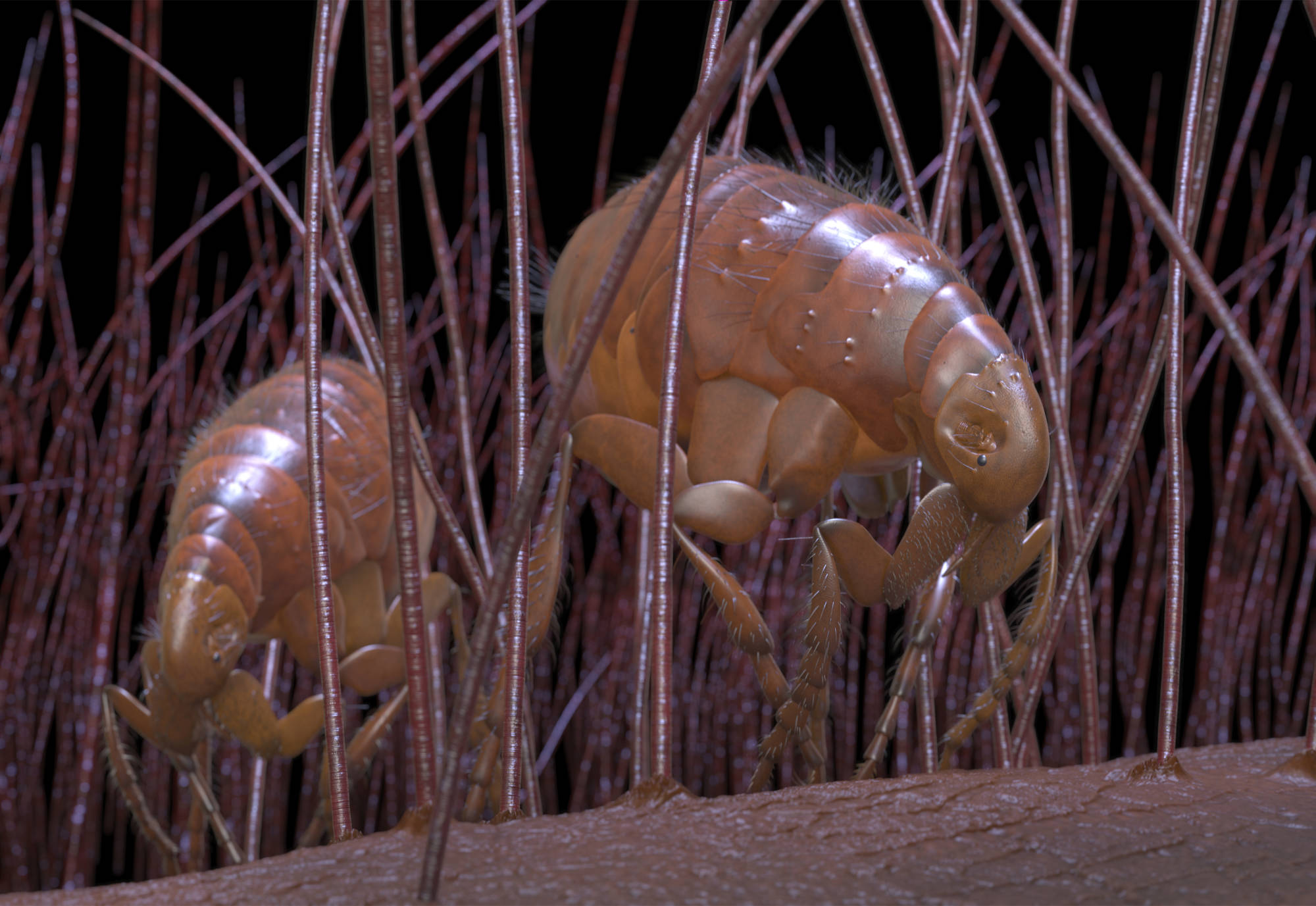 Oriental rat fleas on the back of a rat - carriers of Bubonic Plague.