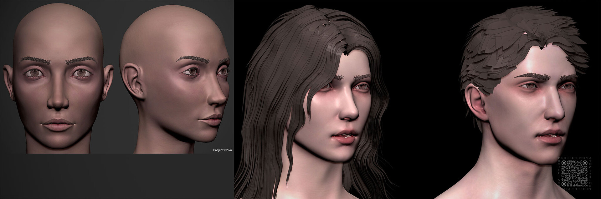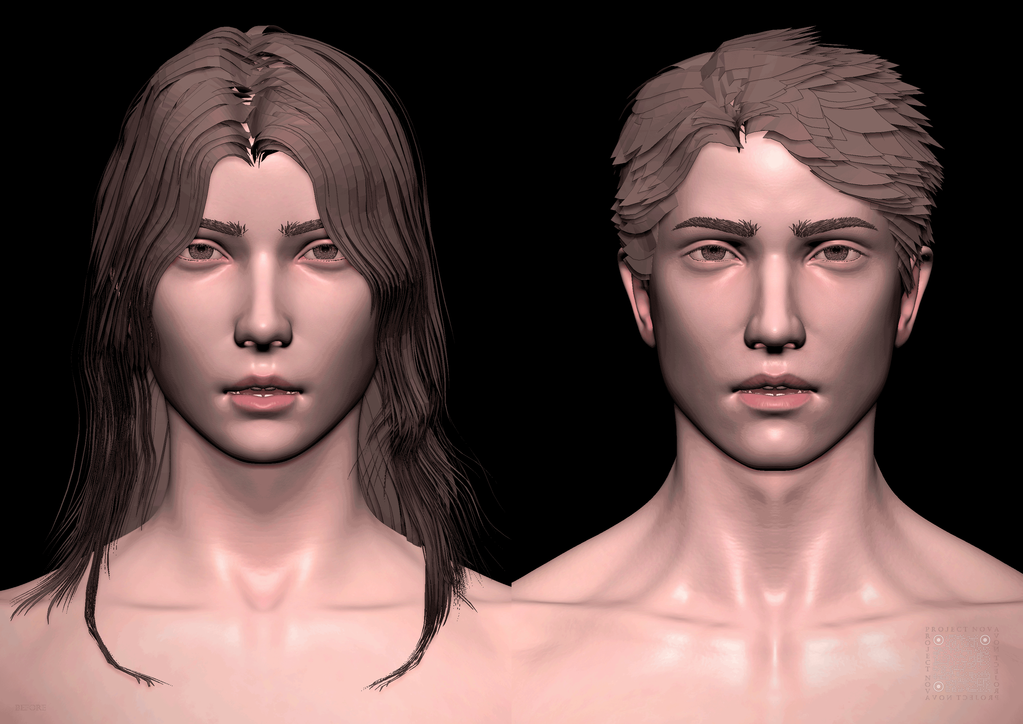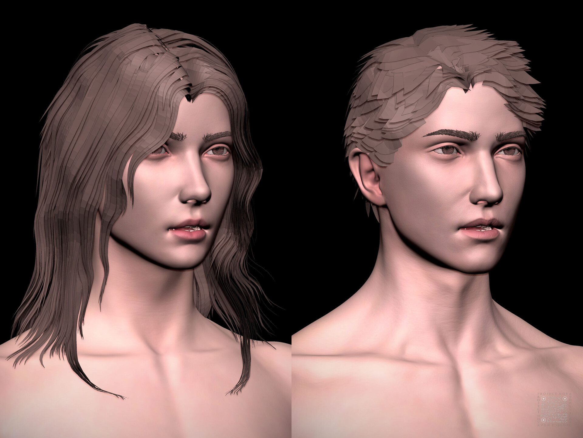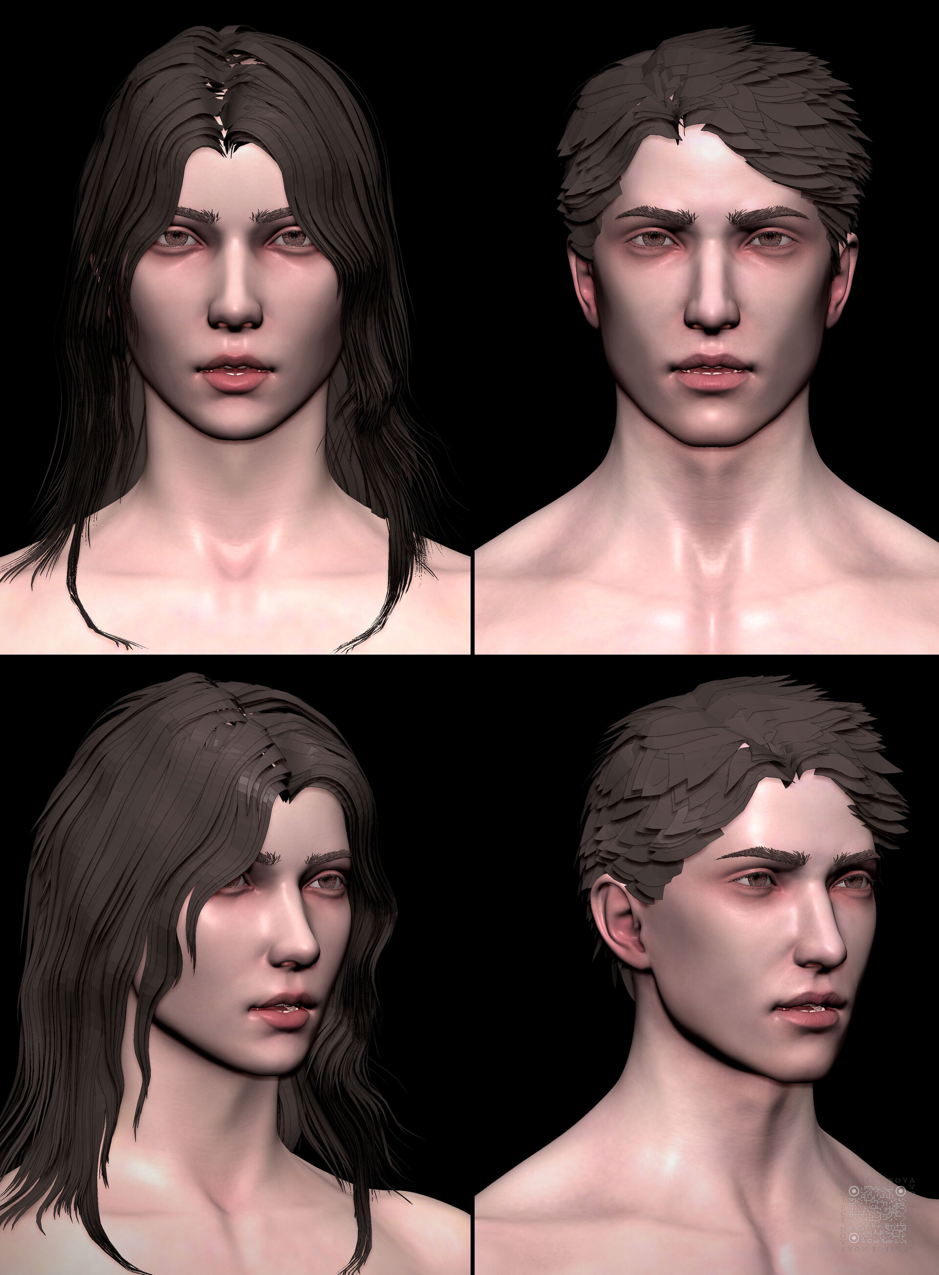 I made some less terrible placeholder hair for the female basemesh, more face ratio/proportion tweaks, smoothed out some areas. Probably pretty close to being able to start adding in finer detail like skin creases and wrinkles on the female mesh, male mesh still needs face work.