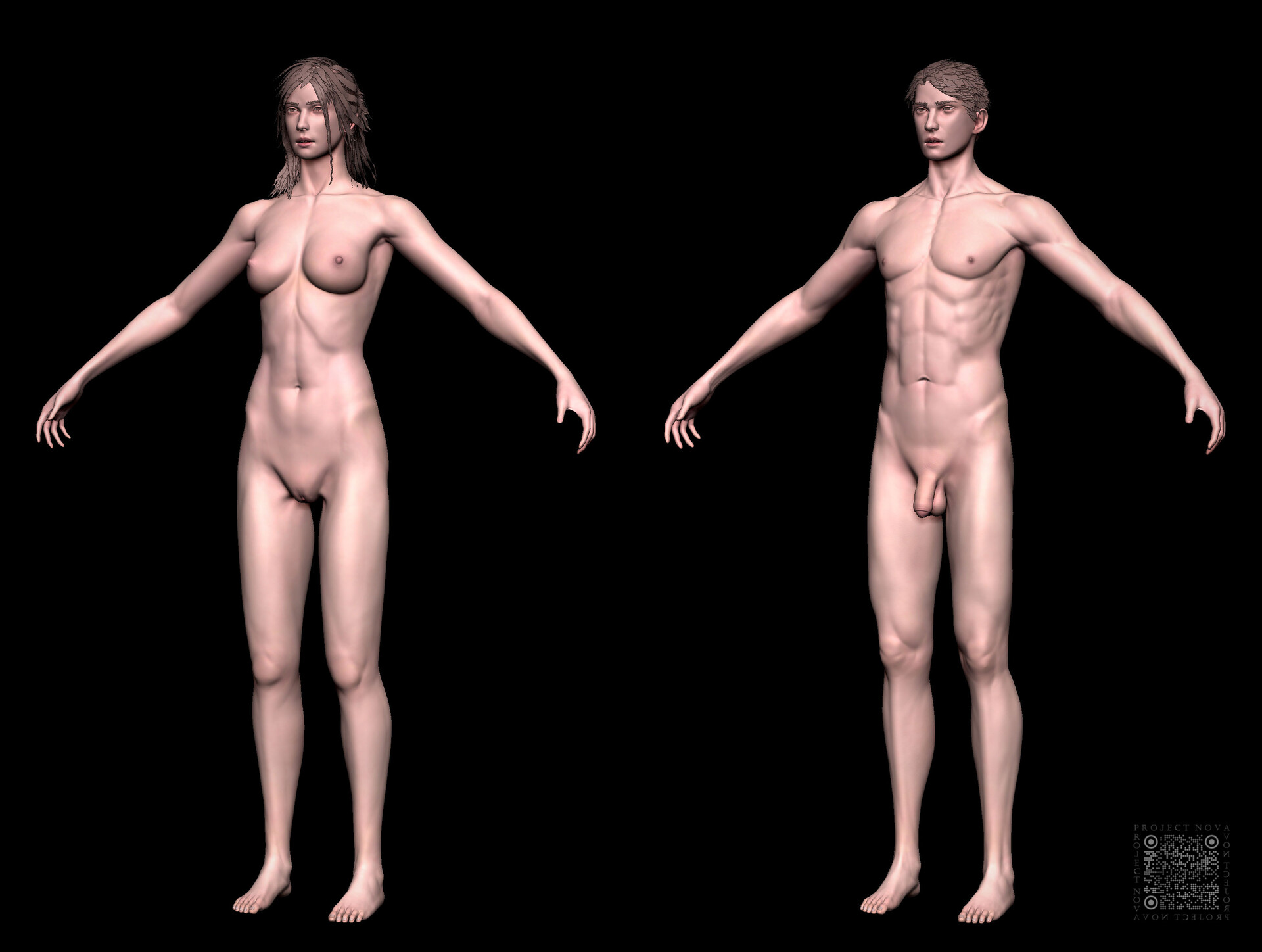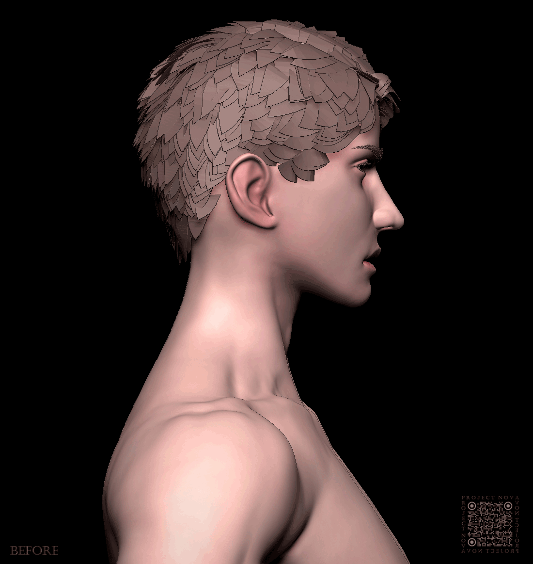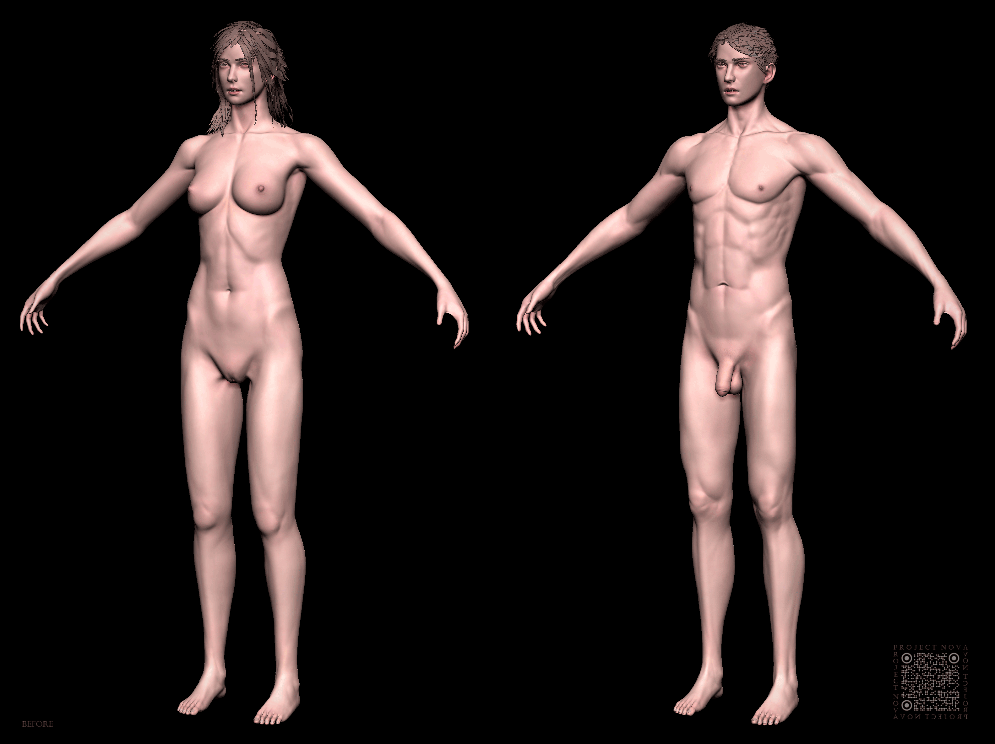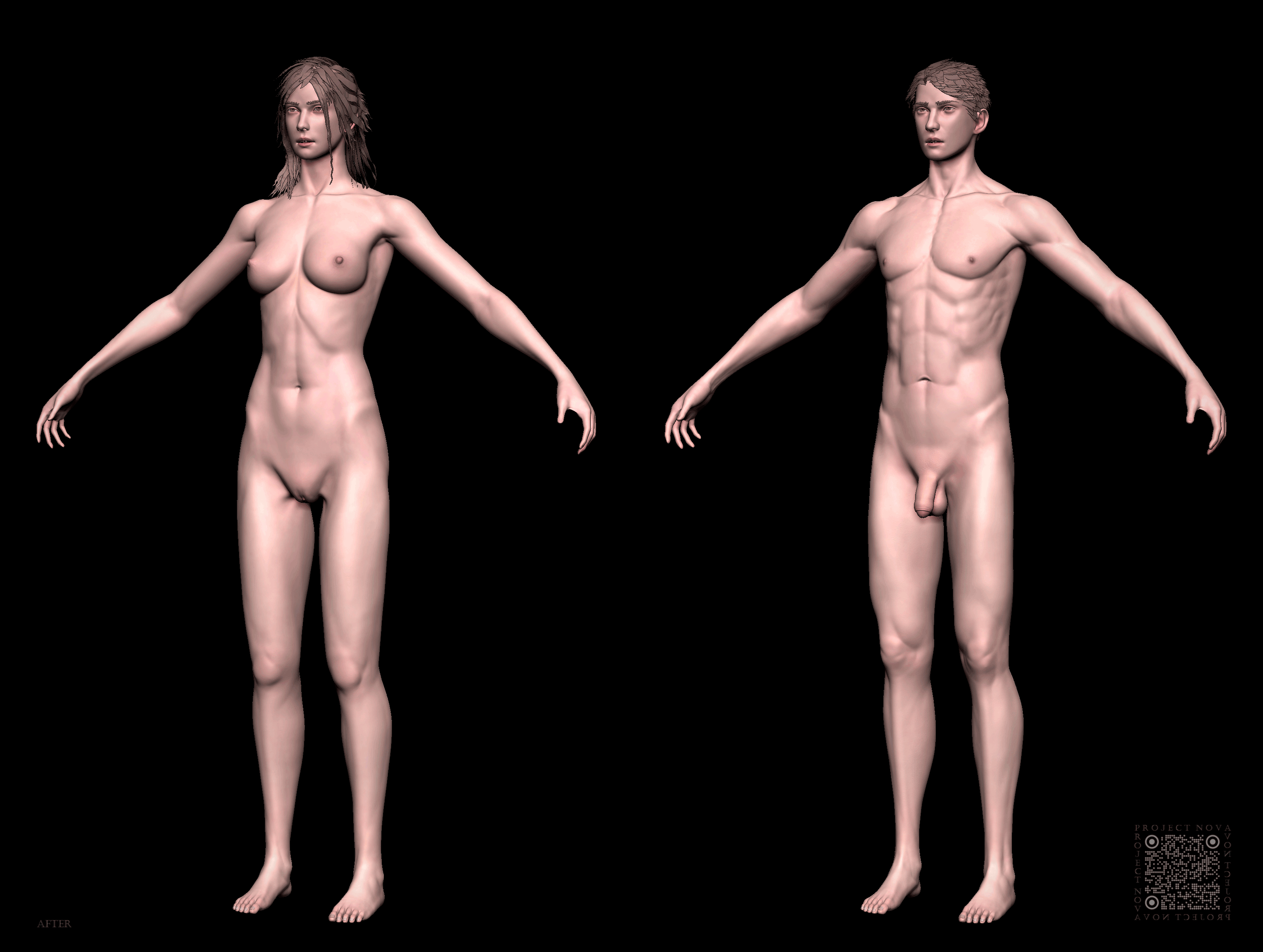 I made some less terrible placeholder hair for the female basemesh, more face ratio/proportion tweaks, smoothed out some areas. Probably pretty close to being able to start adding in finer detail like skin creases and wrinkles on the female mesh, male mesh still needs face work.