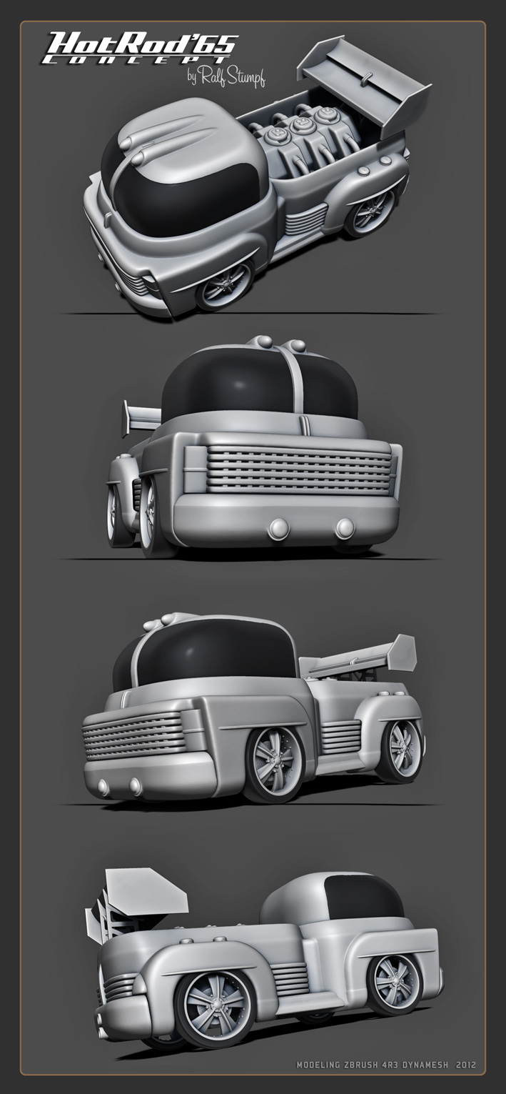 I made a HotRod Toy Truck entirely with Zbrush. Design wise it’s a kind of concept Hot Wheels.