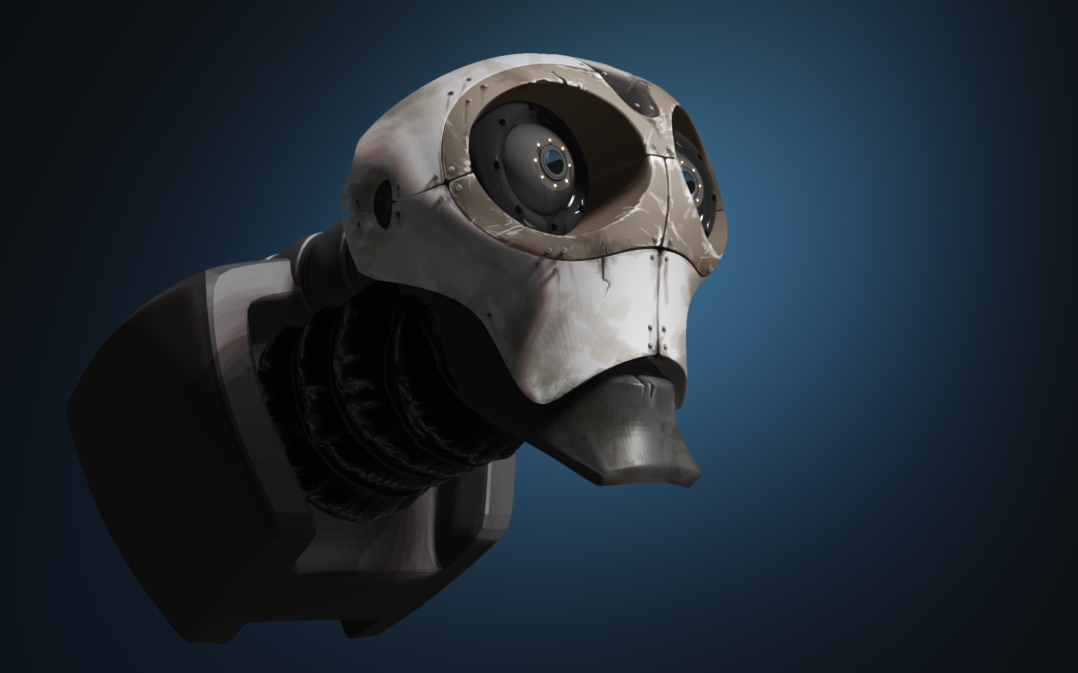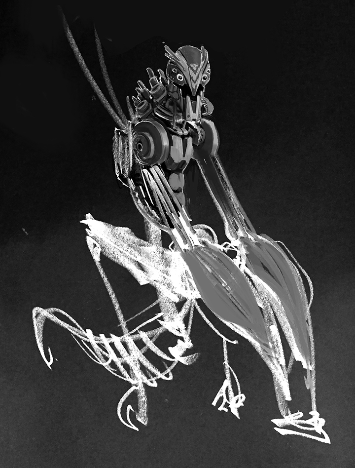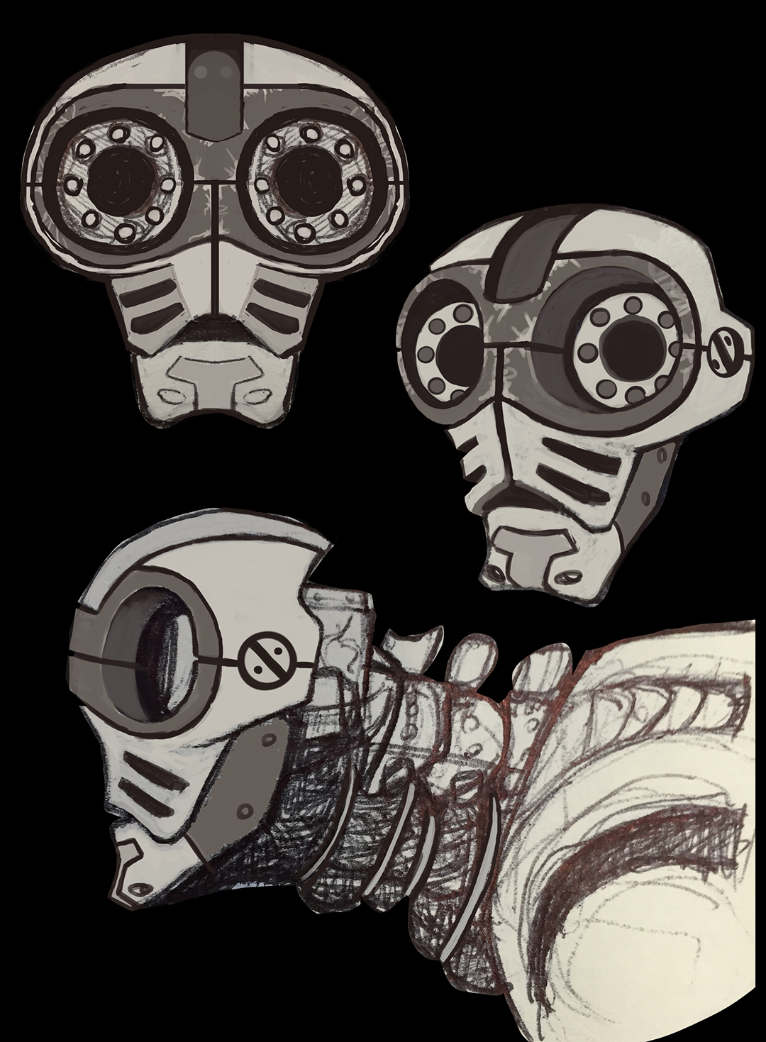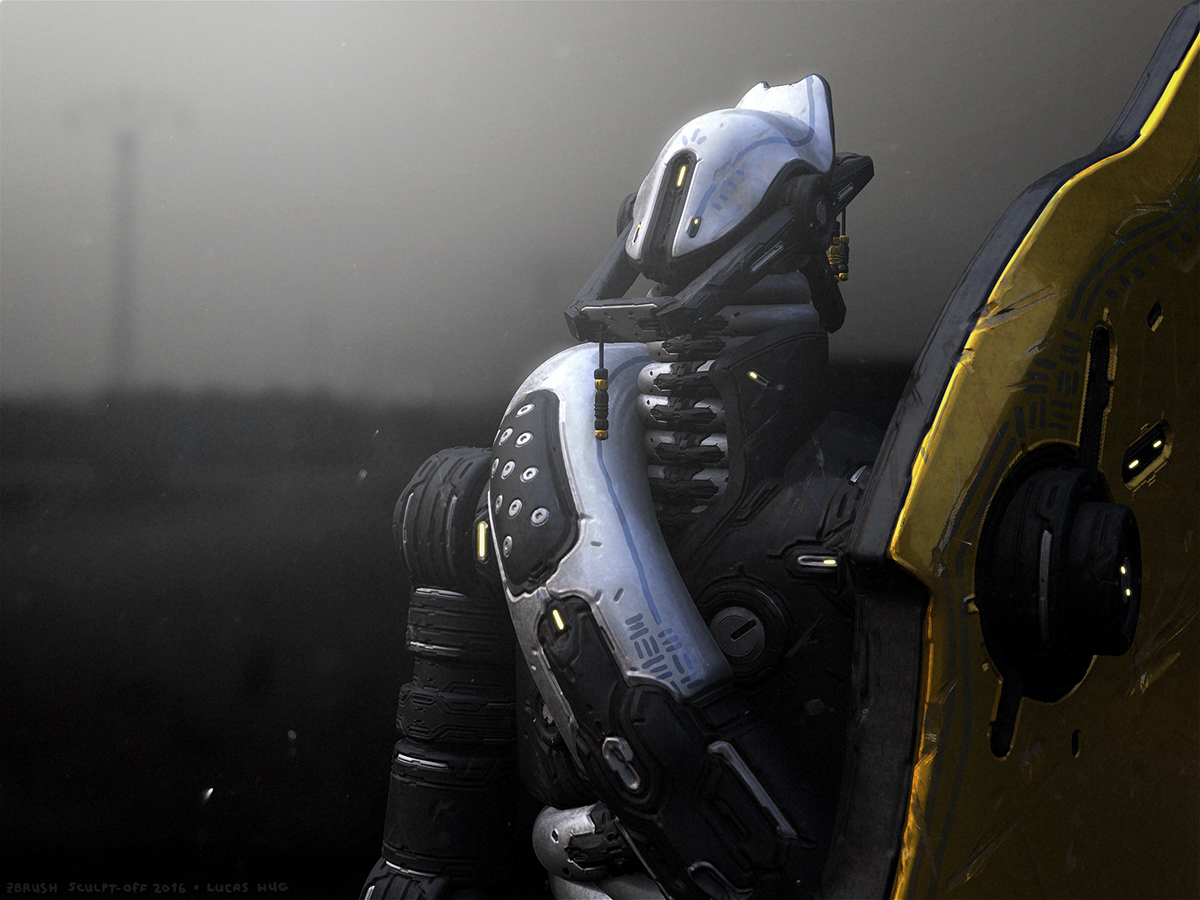 So anyway, I discovered that cyberpunk was defined as high-tech low-life. Since the idea of the sculpt off was to have man and machine scavenging for common necessities, I decided to go the scavenger route. The last image shows some experimentation with adding a nap-sack–an idea of him exploring and finding parts he needs.