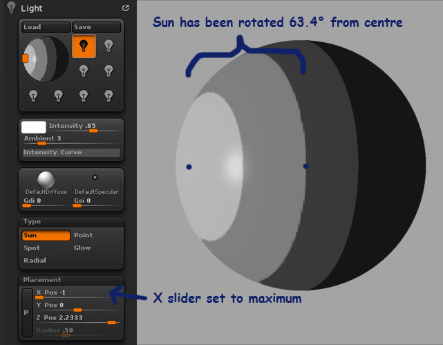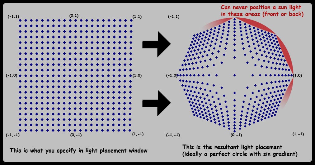 (from what i can tell the direction of the sun light is that of the line drawn from the x and y placement co-ordinates on a -.5 z plane through the origin)