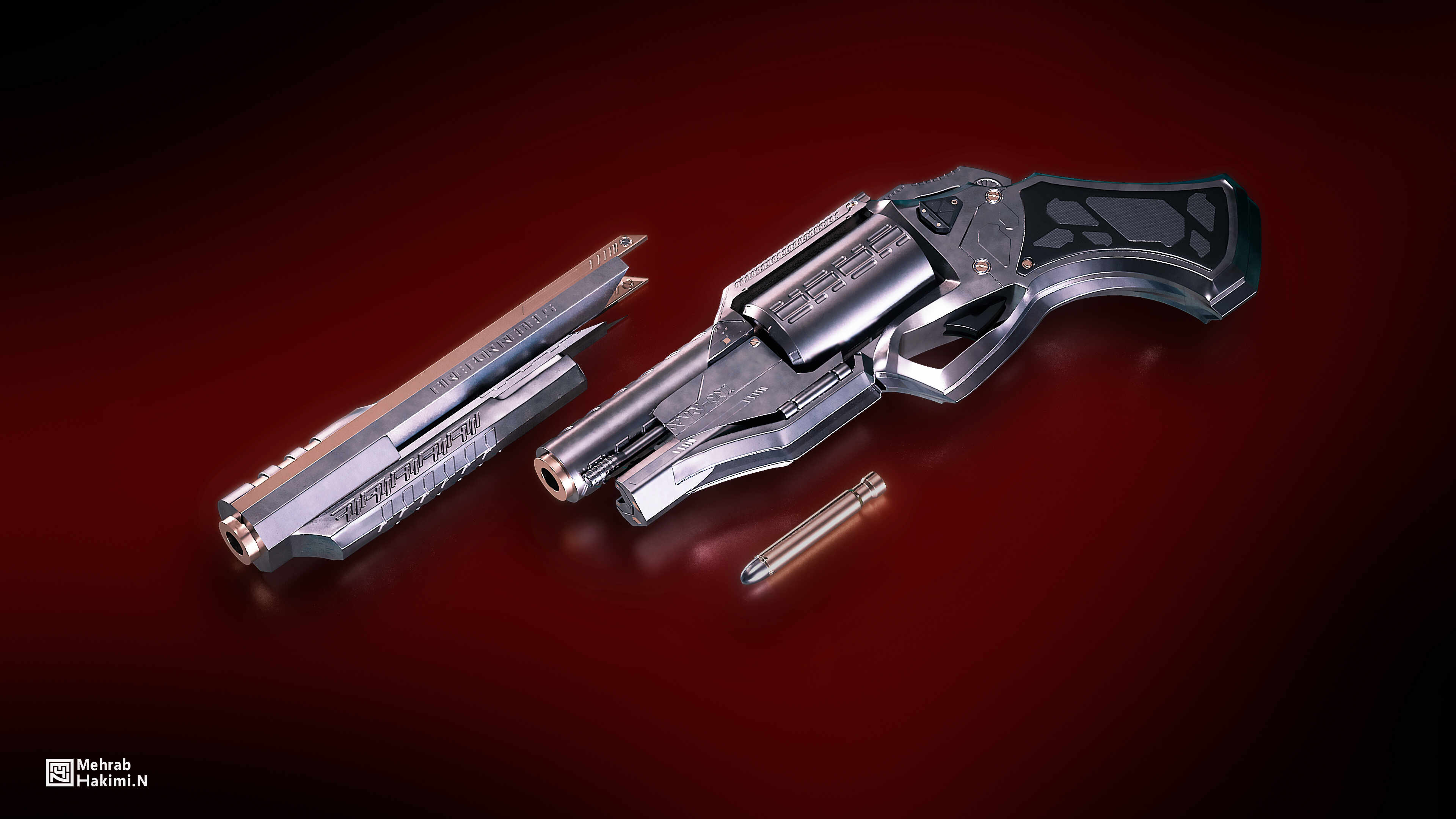 RVN-001 is a stylized revolver pistol with a modular barrel extension designed to increase range. I built it around the idea of rebellion—hence the engraved slogan “Fire for rebels” , which anchors the piece in a narrative of resistance and purpose.