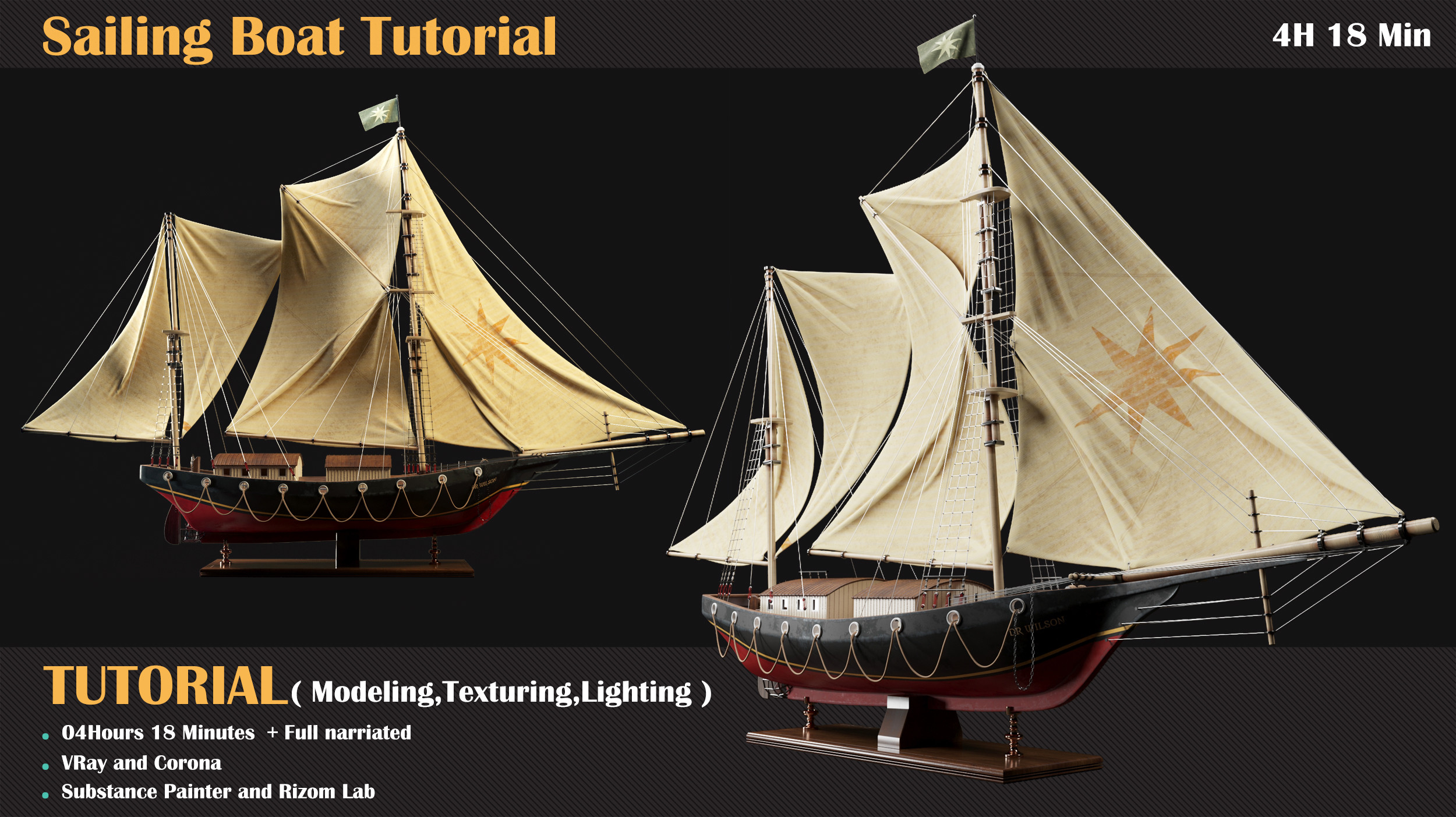 Hi, you are very welcome to the training course on building a sailing ship. In this course, we have 3 general sections. Modeling, Unwrap ,Texturing, Material and Lighting in