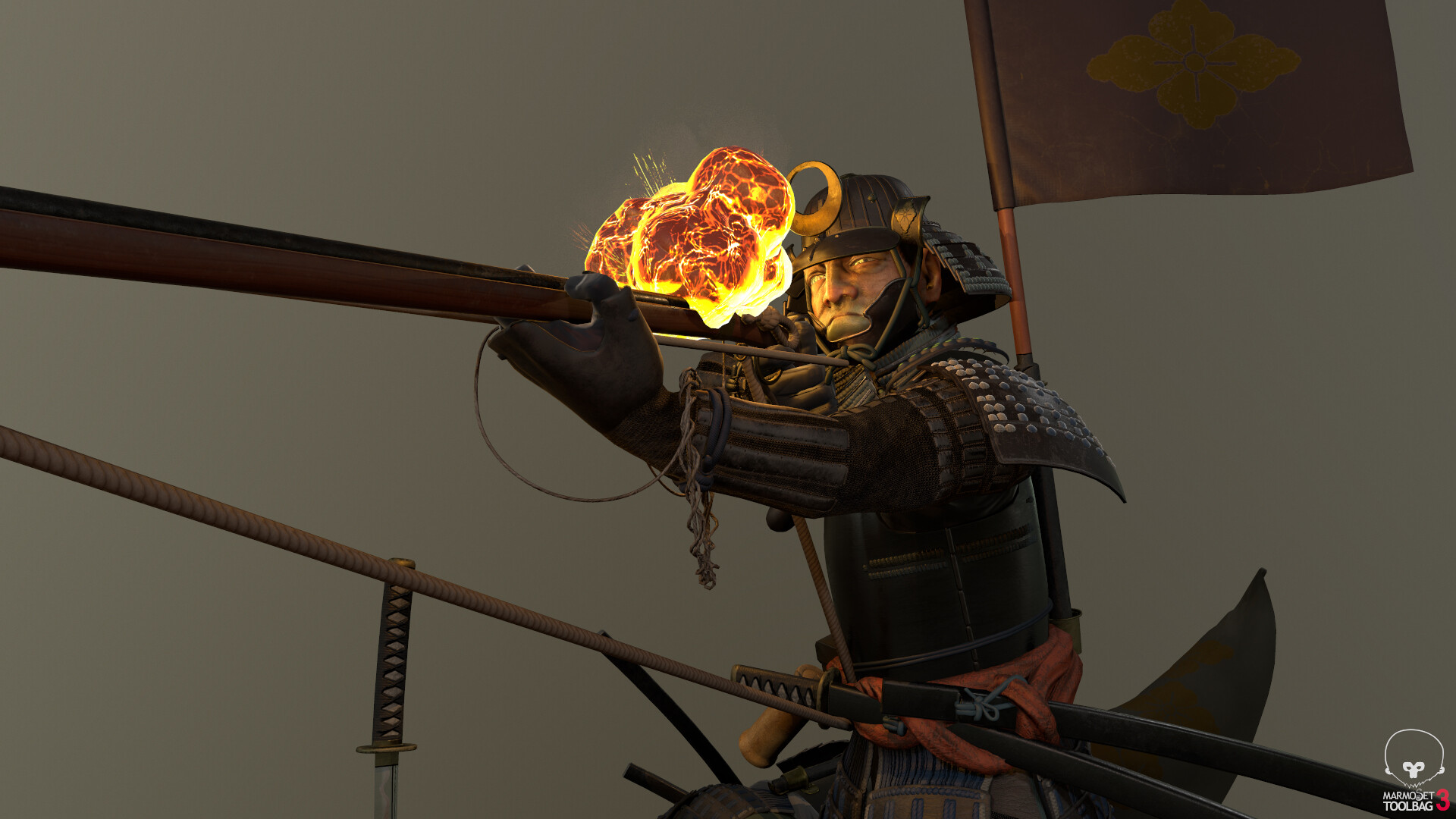 The rope tying the gun to his waistband is a kind of medieval night-sight, where the length of the cord pulled taut would allow the gunner to have the proper elevation for his shot. (Got this from “Giving up the gun: Japan’s reversion to the sword, 1543–1879” by Noel Perrin, p. 40.)
