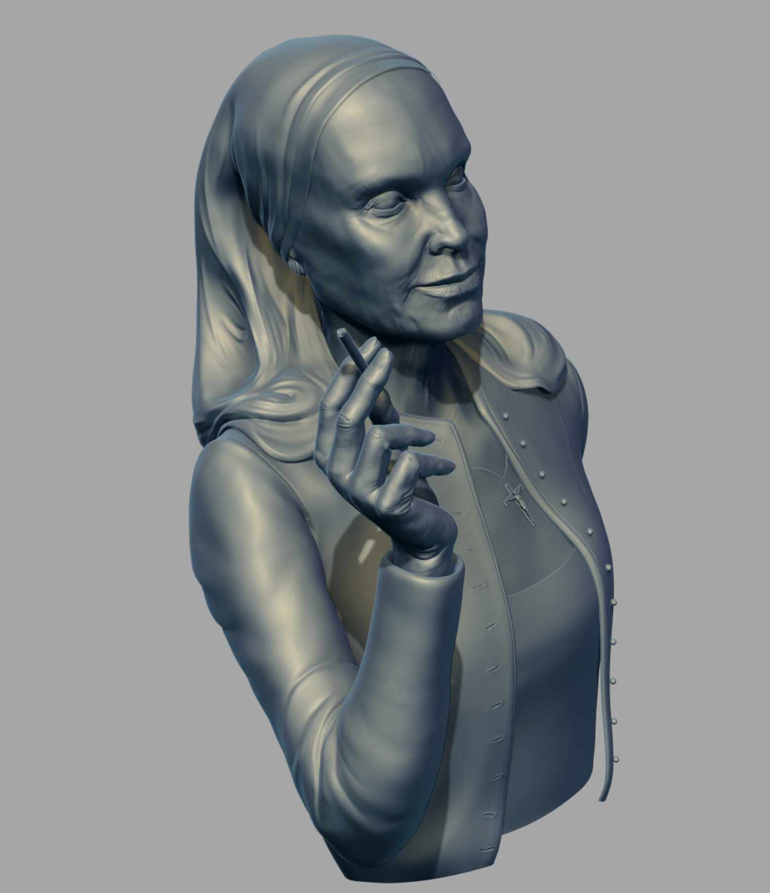 Hello! WIP Likeliness practice sculpt of Jessica Lange as Sister Jude Martin in American Horror Story. Now I will proceed to texturing and creating hair! Really enjoyed creating this project in ZBrush. Have a lovely day!