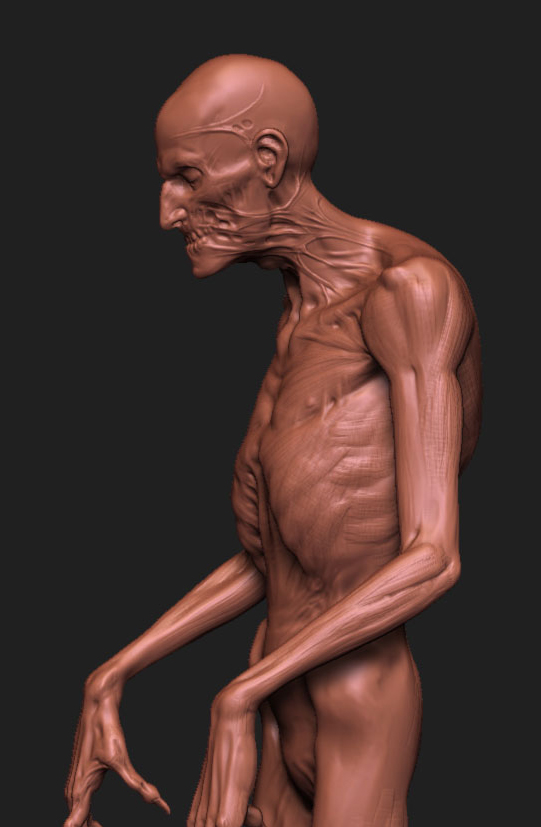 I a have a little bit of feedback for you (although it feels a bit like the student teaching the teacher). I think the rib-cage feels a bit too solid and a tad too big. Think it needs to look fragile to fit into the ages of the zombiefide man.