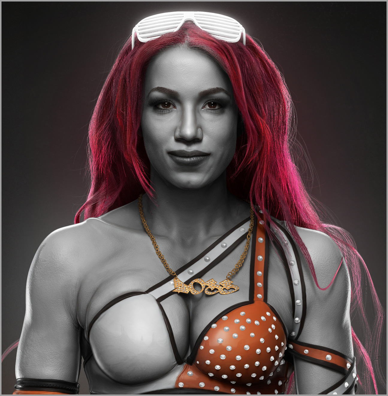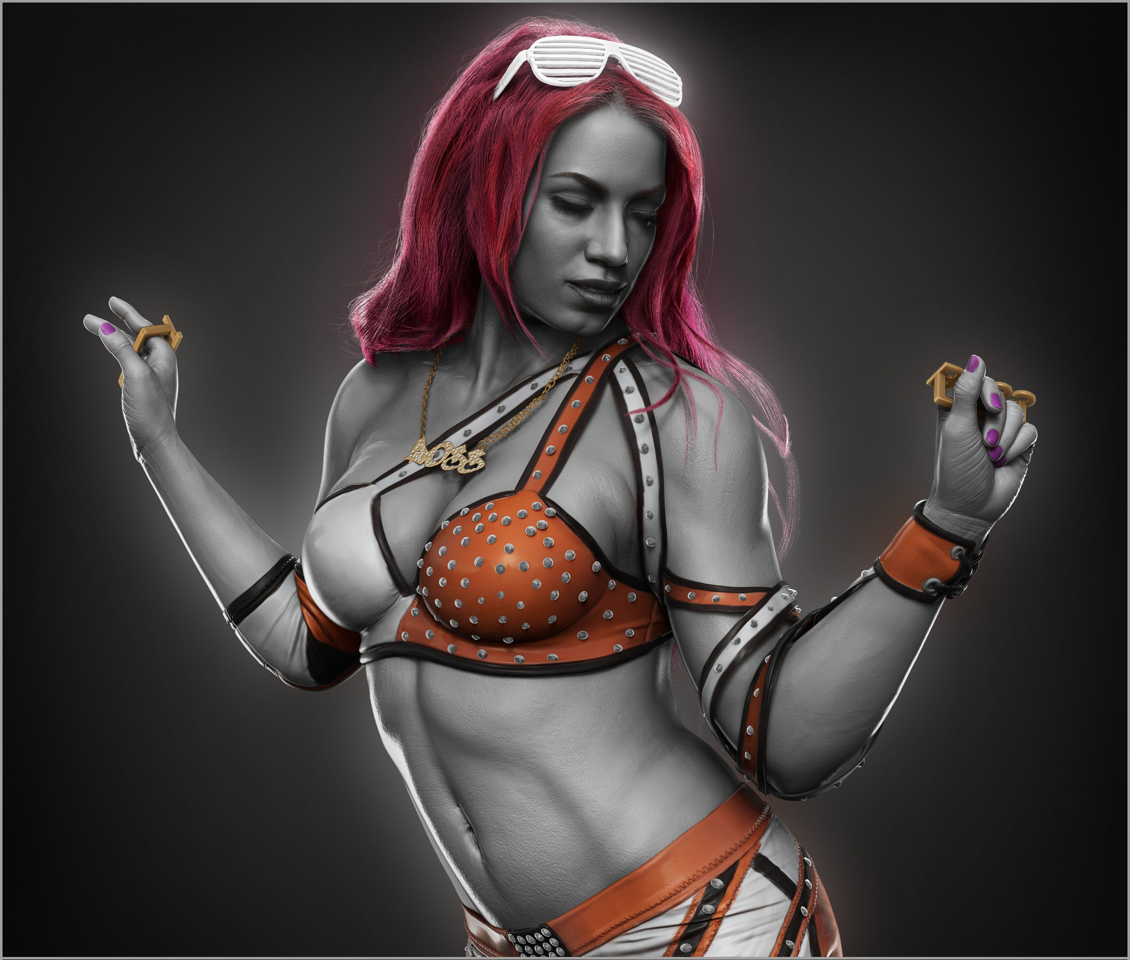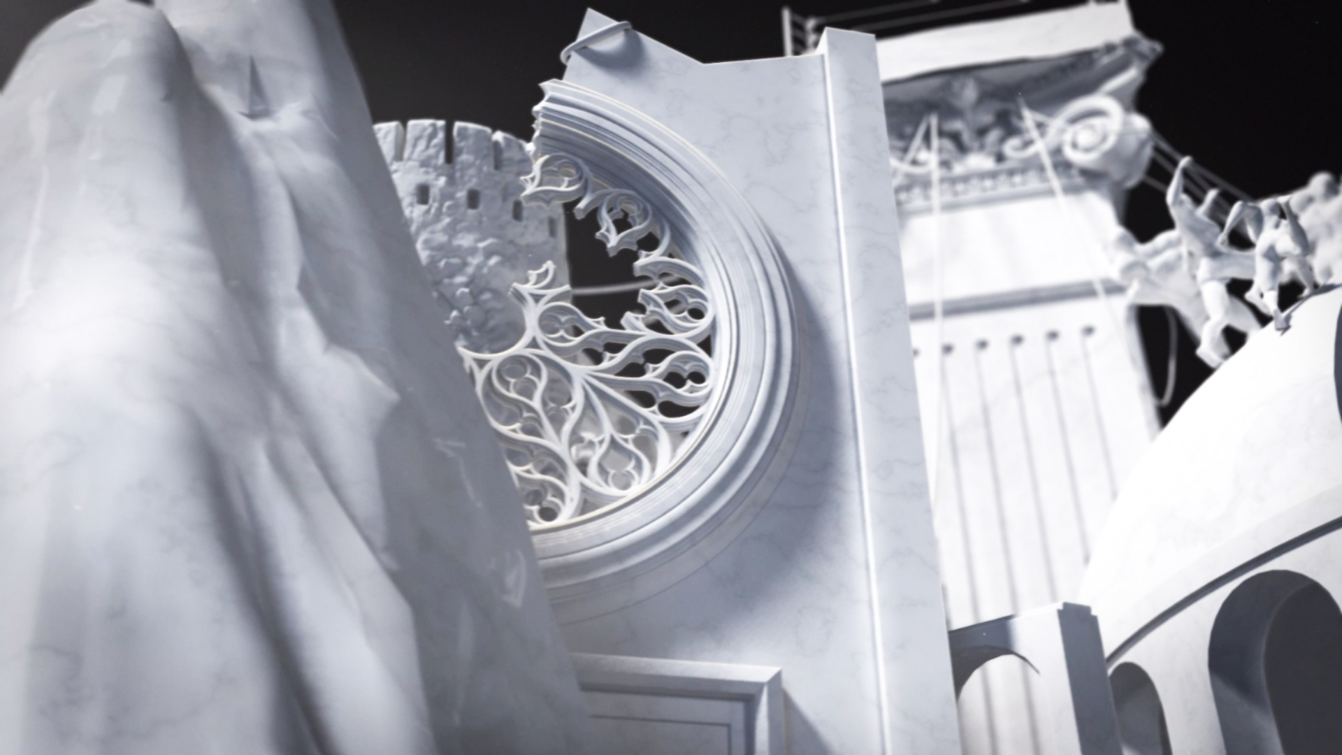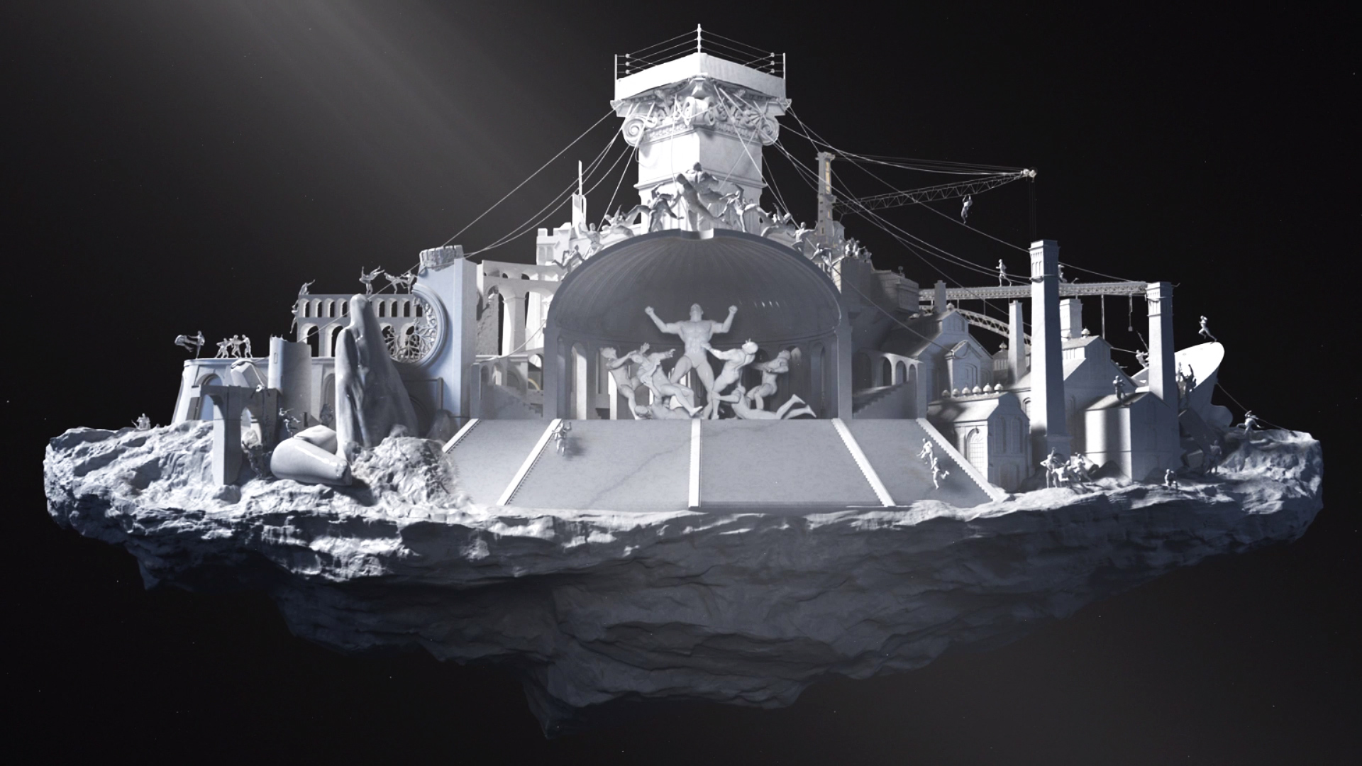 Labored on over the course of a year, hyperrealistic statuettes of wrestling talent were hand sculpted and then later shaded to look like marble in Maya. An enormous and detailed tableau provides the backdrop for the reimagining; referencing structures from ancient kings on the left and progressing to more modern structures that nod towards the robber barons of the industrial revolution. A leitmotif of ornamental detailing weaves itself throughout the piece creating a cohesion that culminates with the apex, a ring that all the competitors aspire to conquer.