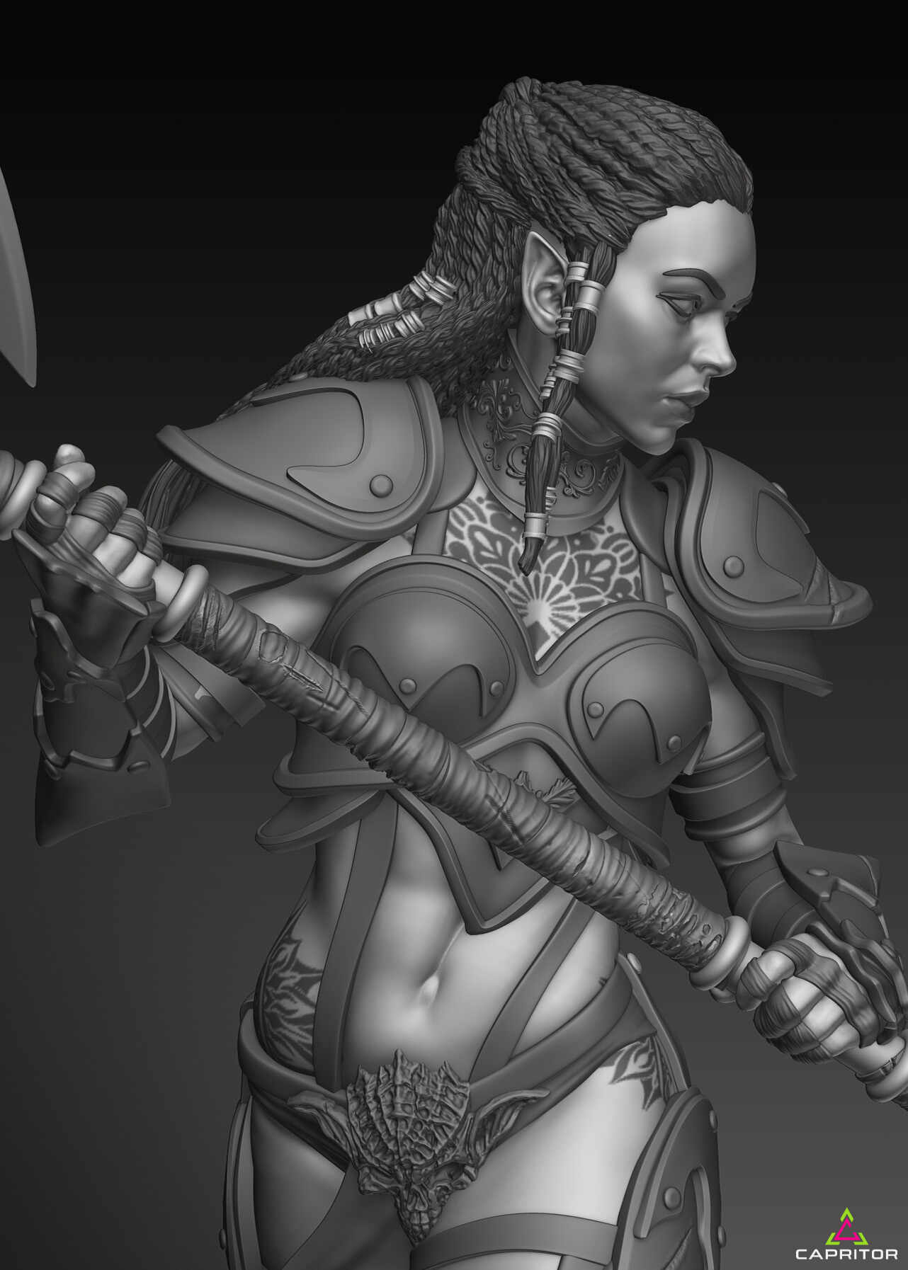 We would like to share another one of our 75mm models: our elvish warrior, Selvaggia. This model was created entirely with ZBrush.