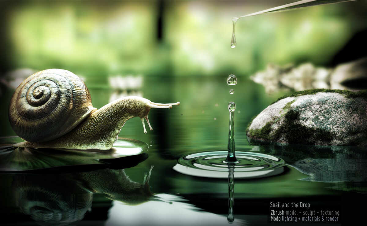 this is personal work, where i used zbrush to sculpt the snail, body and shell. I wanted to get a placid feeling and to make it all in a shot I added the drop that just fell. Hope you like it …!