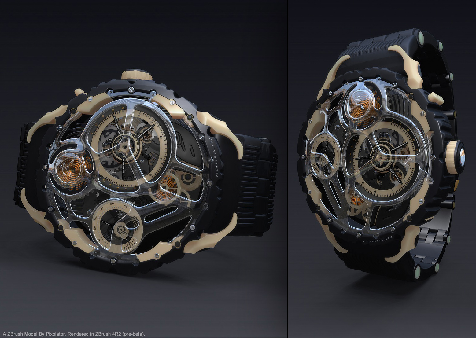 Test renders of the wristwatch which was created in ZBrush 4 (Click here to see the wristwatch movies)