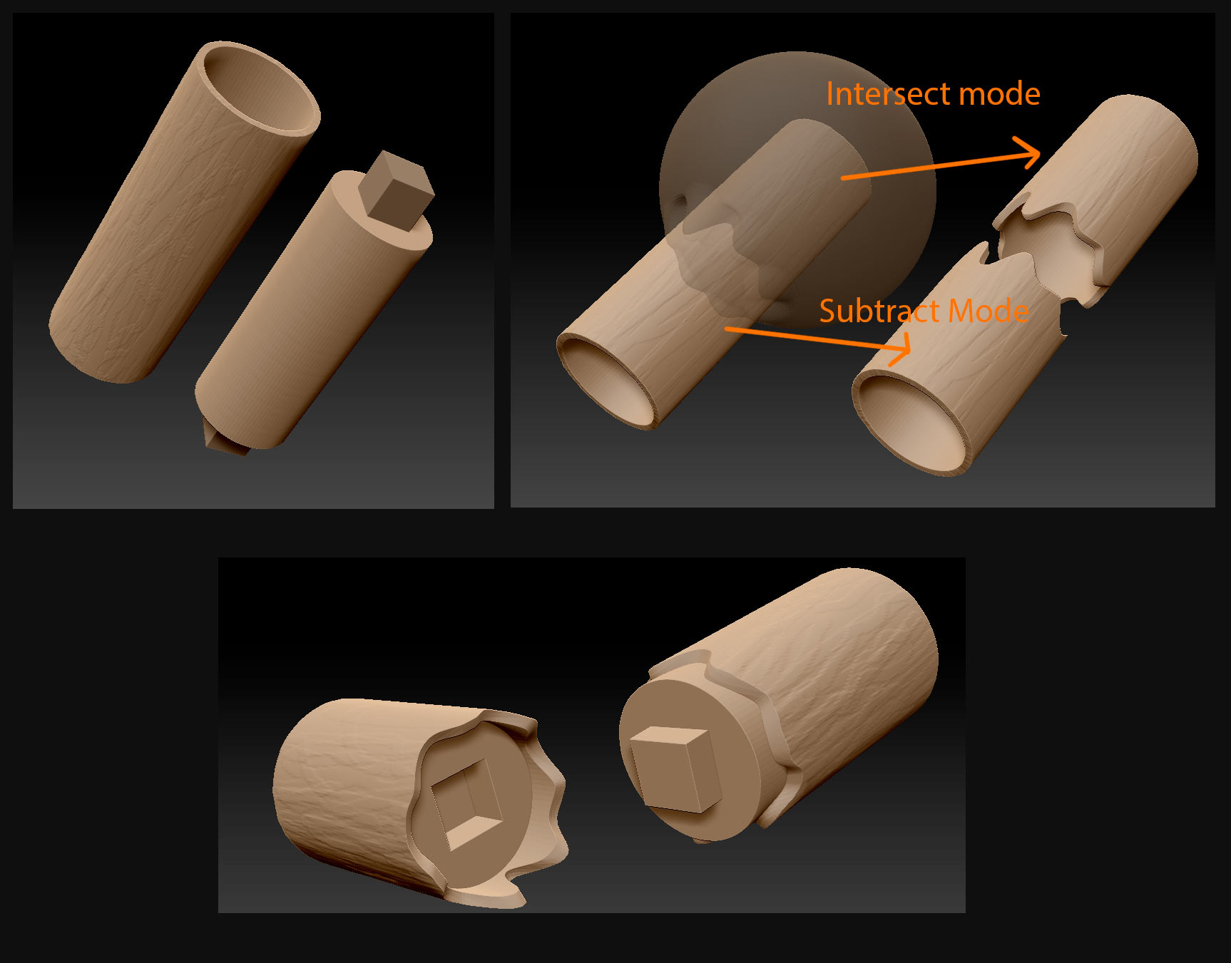 You can then adjust these pieces independently of the “core” cylinder, and then recombine them with Live Boolean to produce complete pieces with a mechanically precise interior portion and key slots that fit together. You may wish to slightly increase the size of the core cylinder so that it intersects with the bark and will fuse together cleanly, and you may wish to slightly decrease the size of the cubical key so that it overcomes any swelling that may be a part of the printing process and still fits cleanly into it’s slot.