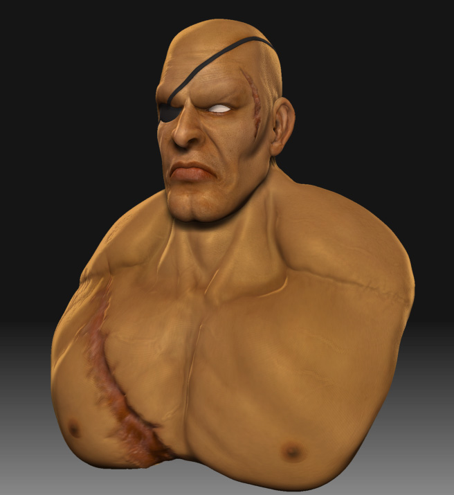 Here is a bust of Sagat from the Street Fighter series that I had done in ZBrush 2. The sculpt started from a very basic head model. Now that Z3 is here I may actually move onto creating the rest of his body using the new topology tools. We will see, so many things I want to sculpt, so little time.
