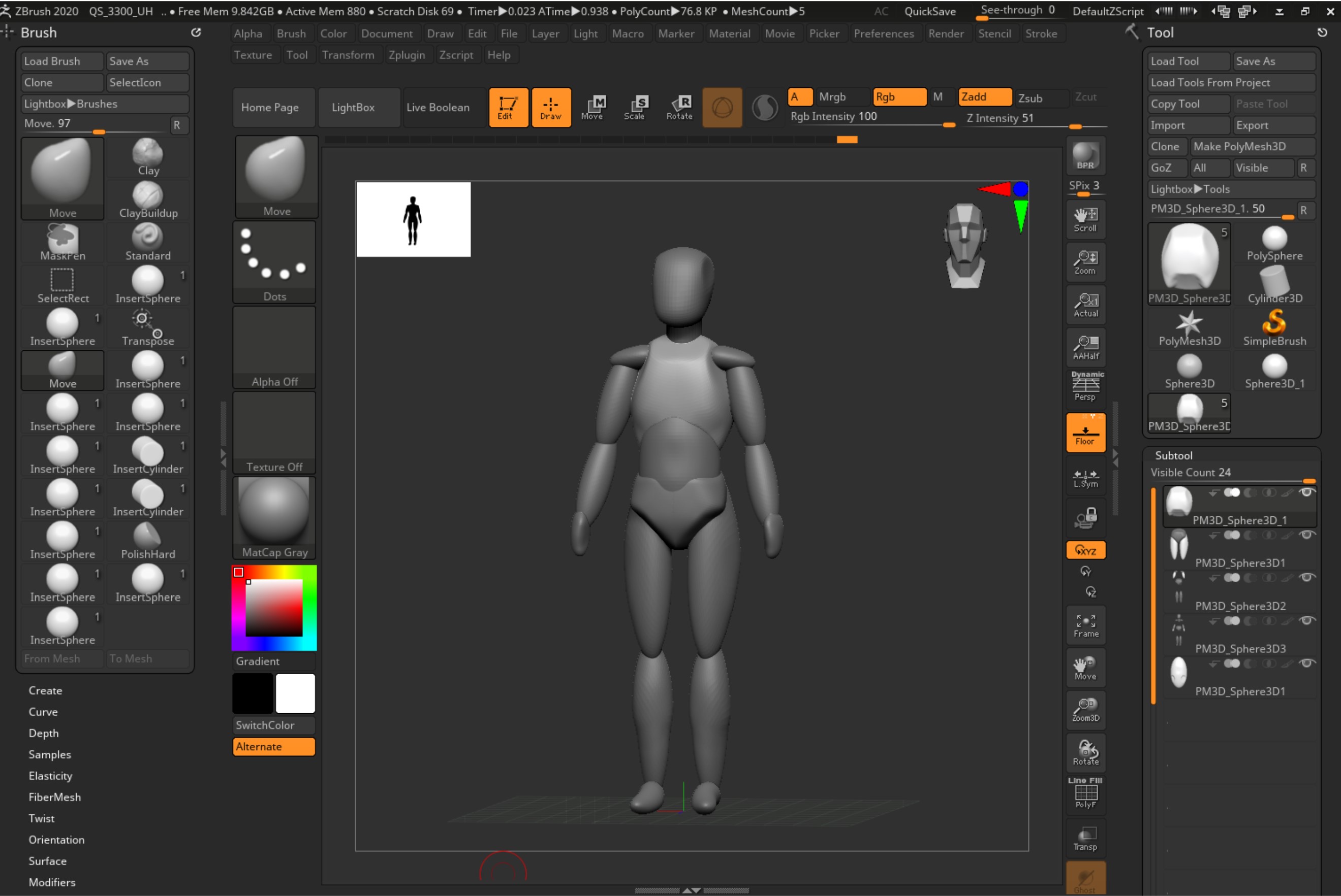 Essentially, this begins by creating a character using the process of ‘blocking out’. The blocking starts with a Sphere3D, and adds other spheres/sphere brushes as you go.