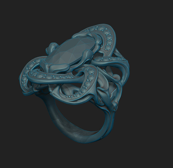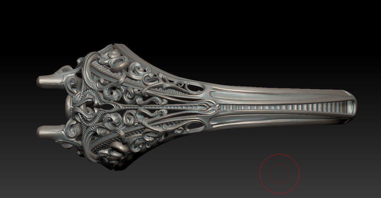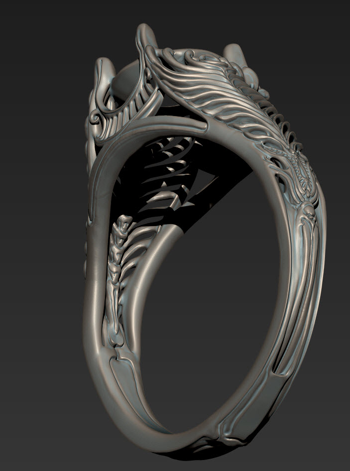 Wow, I sure love the interwoven forms on the ring with the decorative leafy forms. is there any chance you could describe your workflow a little? Do you model the interwoven forms and cut out holes etc. before sculpting? or is it all in Zbrush?